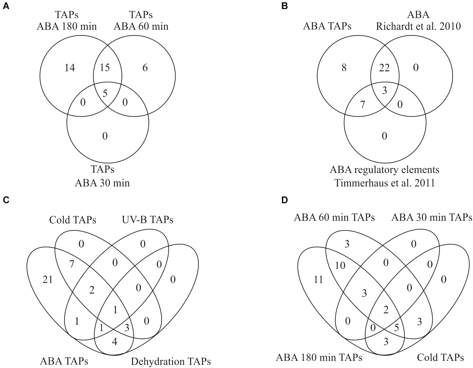 Figure 7. Overlap of transcription associated proteins (TAPs) in our and other stress related studies. (A) Identification of differentially expressed TAPs after 100 μM ABA application for 30, 60, and 180 min. (B) Overlap of ABA-regulated TAPs found in this study with Richardt et al. (2010) and Timmerhaus et al. (2011) (C) All TAPs differentially expressed during cold stress, dehydration and UV-B light are also differentially regulated in response to ABA. (D) Comparison of differentially expressed genes in response to cold and ABA.