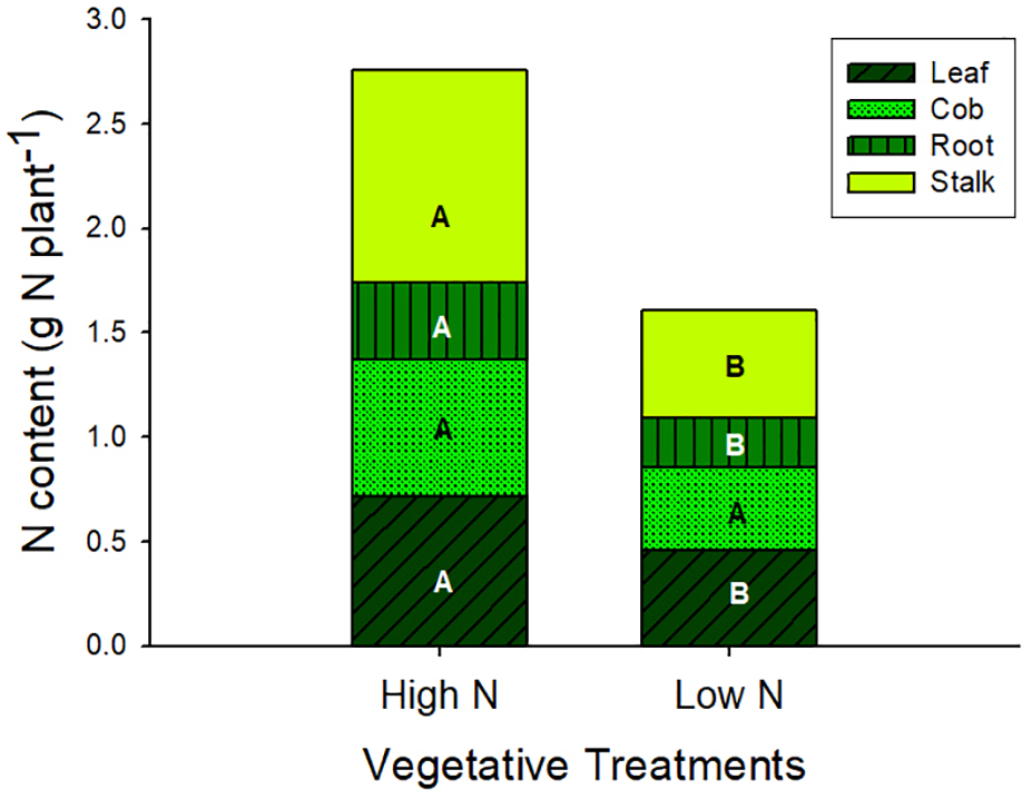Plant N content at silking partitioned across vegetative organ in the vegetative treatments (mean ± S.E.). Different letters indicate significant differences in organ N content across the high N (Nveg) and low N (nveg) vegetative treatments at p < 0.05 (n = 6).