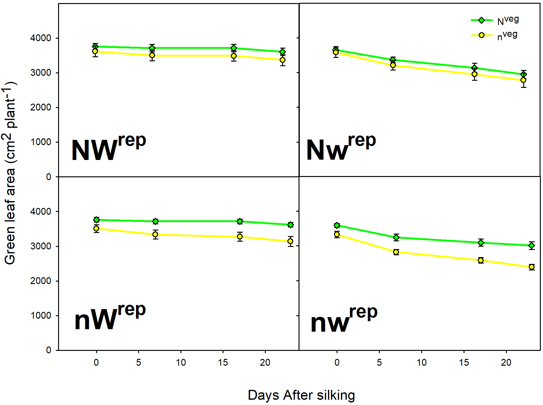 | Low N + Well watered (nWrep) | Nveg | 139.2 ± 5.5 a | 615 ± 17 a | 226.0 ± 5.4 a | 281.8 ± 12.3 a |