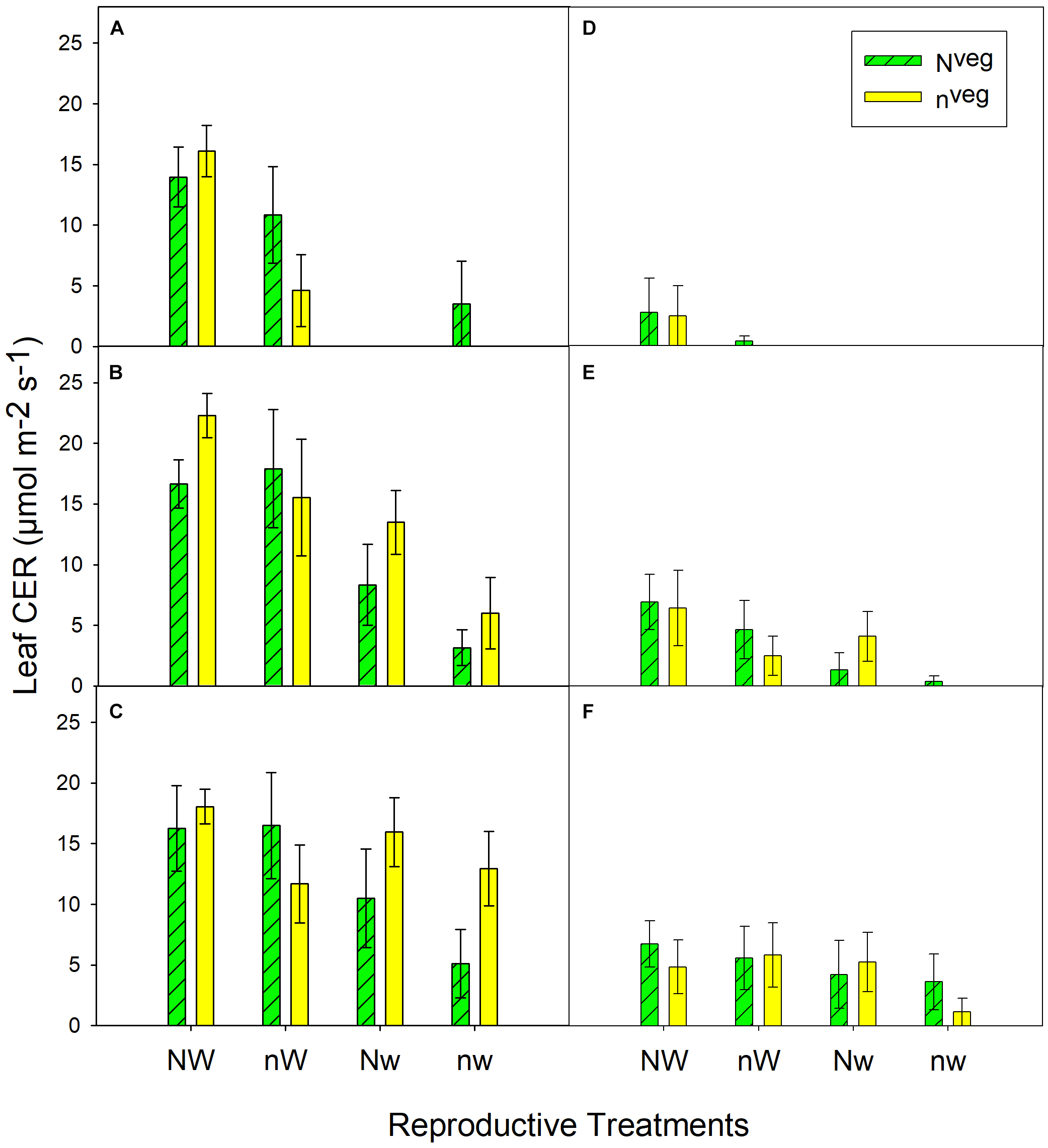 Within reproductive treatments, vegetative treatment means for each parameter followed by different letters (a–b) are significantly different at p < 0.05 (n = 6). Vegetative treatment means are always compared within reproductive treatments.