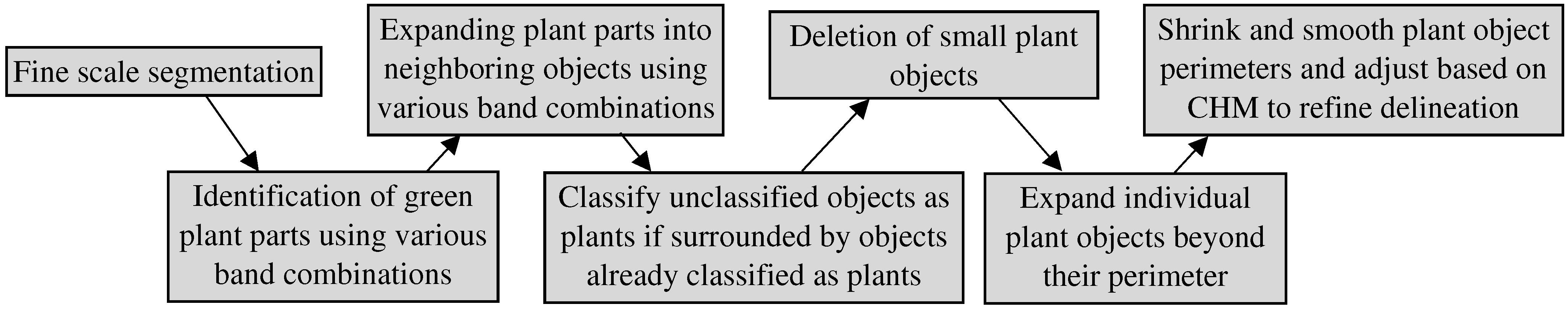 Figure 3. Flowchart showing the individual steps in the object-based image analysis process used for delineating the tomato plants.