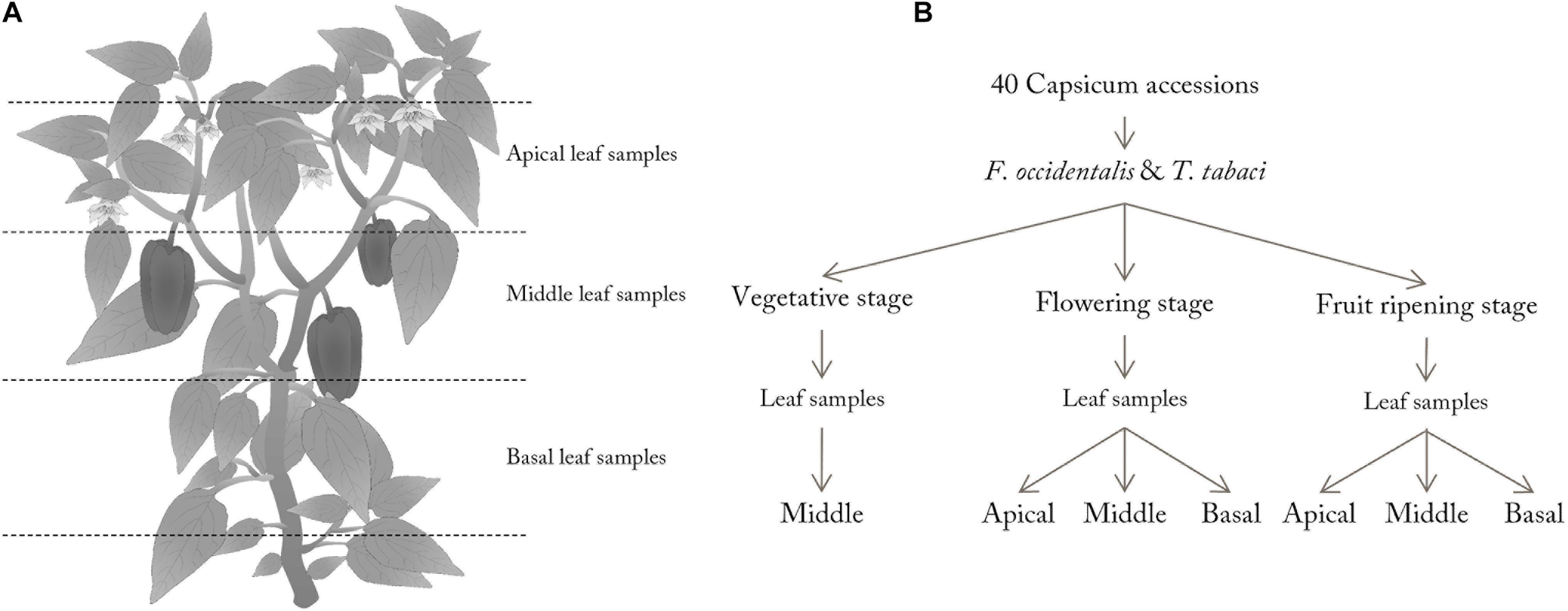 Various studies have explored sources of thrips resistance within the genus Capsicum (Fery and Schalk, 1991; Maris et al., 2003a; Maharijaya et al., 2011). Accessions resistant to thrips were characterized based on reduced preference, feeding or reproduction rates, or increased thrips mortality (Fery and Schalk, 1991; Maris et al., 2003b; Maris et al., 2004; Maharijaya et al., 2011). However, the various accessions tested do not always show consistent results throughout these studies. For example, the sweet pepper accession “Yolo Wonder” was reported to be resistant to F. occidentalis by Fery and Schalk (1991), but later identified as susceptible to the same thrips species by Maharijaya et al. (2011). These inconsistencies among studies might be explained by the fact that the accessions were screened at different ontogenetic stages. Because plant development is accompanied by physiological changes, resistance levels assessed in one ontogenetic stage cannot simply be extrapolated to other ontogenetic stages (Broekgaarden et al., 2012; Stout et al., 2013; Visschers et al., 2018a). Capsicum is a perennial plant, which bears fruits up to at least 160 days after the seedlings are planted (González-Dugo et al., 2007). An individual plant can suffer thrips damage from the early vegetative stage to the mature, fruit-bearing stage. Constitutive leaf-based resistance to thrips over the entire plant’s ontogenetic development is therefore a key trait for a more sustainable and successful cultivation of pepper. In addition to ontogeny, leaf position can affect the level of thrips resistance. Resistance to a given pest is known to differ between young and old leaves (van Dam et al., 1995; Visker et al., 2003; Alvarez et al., 2006; Gutbrodt et al., 2012). Moreover, whole plant assays have shown that within plant distribution of thrips is plant species- and cultivar- dependent (Reitz Stuart, 2002; Reay-Jones et al., 2017). Leaf position and ontogeny have, to our knowledge, not been included when screening for constitutive leaf-based resistance to thrips in Capsicum.