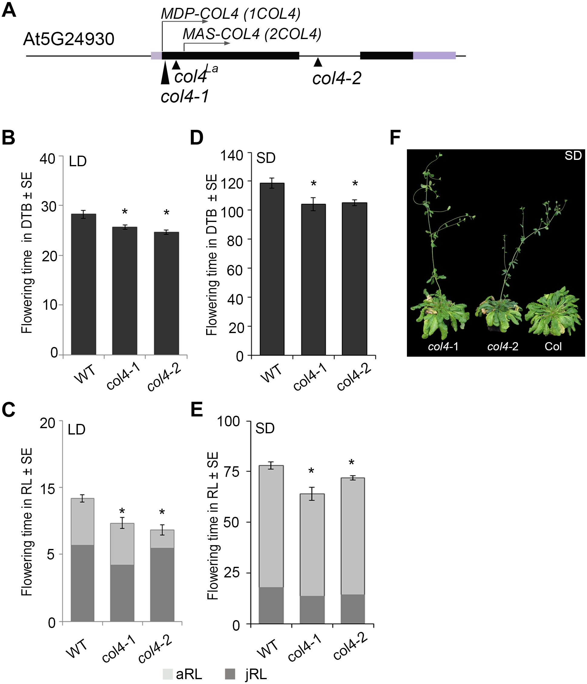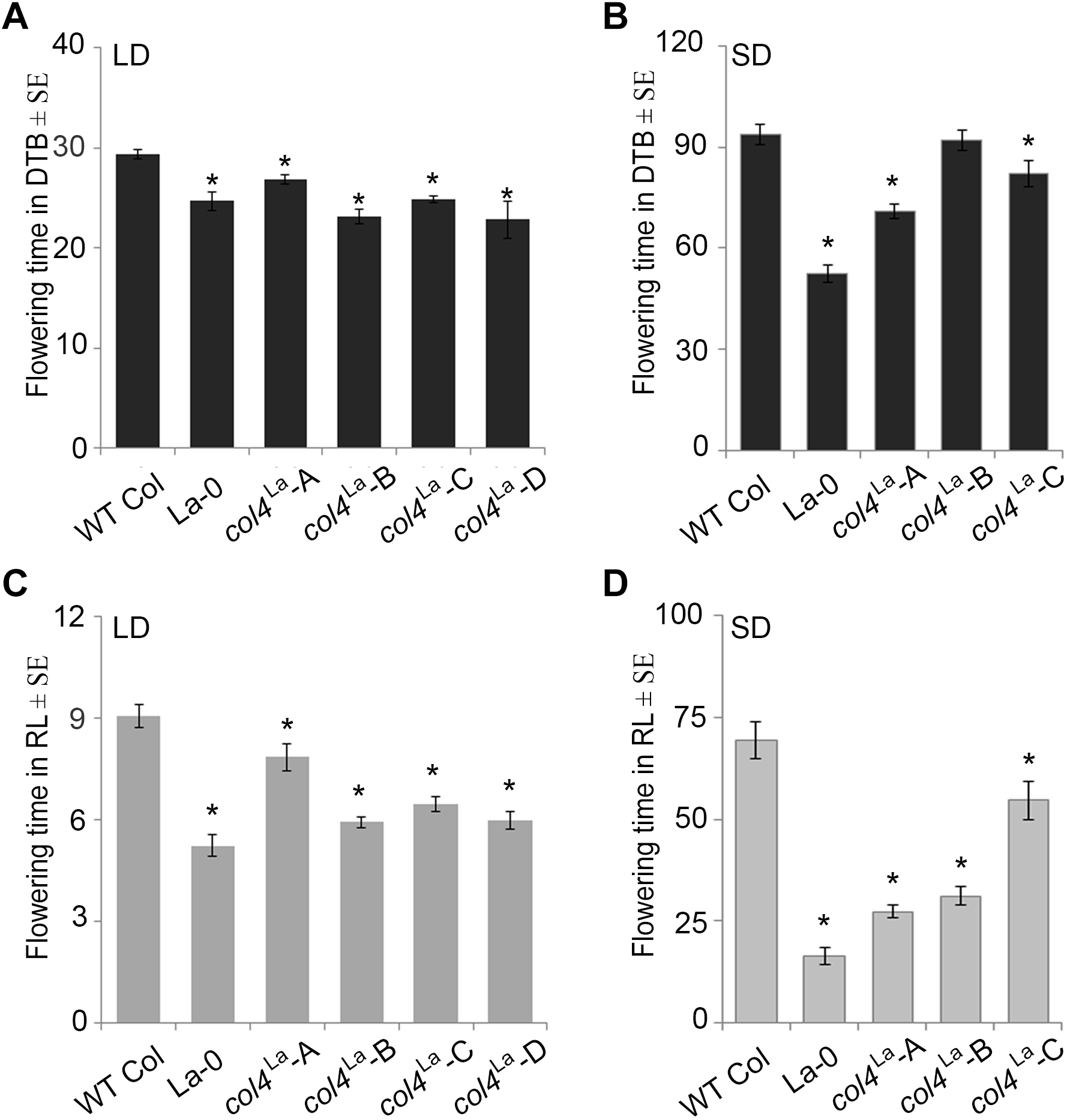 Loss of COL4 accelerates flowering time. (A–D) Flowering time of independent Columbia col4LA introgression lines (Landsberg allele col4LA in Columbia background) in LD (A,C) and SD (B,D); Shown are DTB (black bars) and RL (gray bars) at flowering ± SE (n ≥ 14 plants). Significance of difference was tested using t-tests. Asterisks denote differences that were significant at p < 0.05 to WT Columbia (∗).