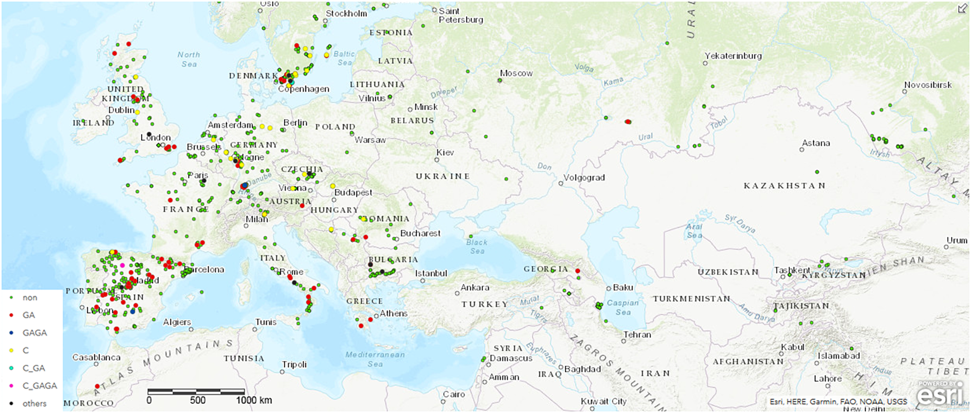 Distribution of ecotypes inheriting the natural variations in COL4. Shown are the origin of the ecotypes carrying (a) the common full length COL4-Sequence (green dots, non) coding for functional COL4 protein, referred here as MDP-COL4, (b) the GA-bp and GAGA-bp deletion at position 82–85 of the genomic sequence (red dots and blue dots, respectively), (c) the C-bp deletion at position 23 of the genomic sequence (yellow dots), (d) the two deletion events C-GA and C-GAGA (neon blue and pink, respectively). For the analysis, the genomic data from the 1001 Genomes project was used (The 1001 Genomes Consortium, 2016). Sequences/ecotypes used are listed in Supplementary Table S1. The map was generated by using longitude and latitude coordinates together with the web based ArcGIS software (http://www.arcgis.com/index.html). MDP and MAS – first three amino acids of the potential proteins. bp – basepair.