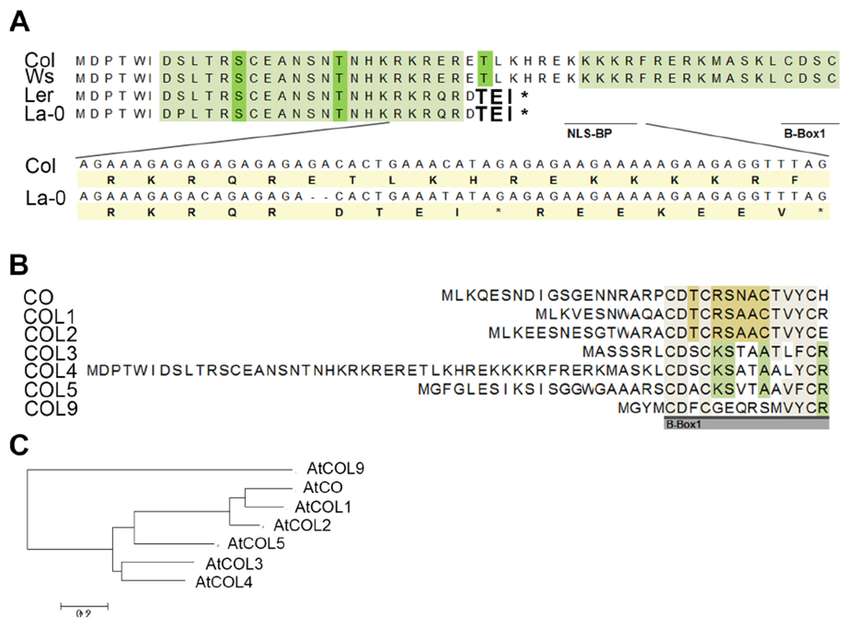 Protein sequence alignment of COL4. (A) Sequence alignment of COL4 from the common lab strains Col, Ws, Ler and La-0. A 2-bp-deletion caused a premature STOP codon in COL4 of Ler and La-0 [see insert in (A)]. Light green amino-acids (AA) represent phosphorylation hotspot and dark green AA a potential phosphorylation site. The potential bipartite nuclear localization signal (NLS-BP) and the 1st B-Box-start site are indicated by underlined AA. ∗STOP codon (B) Sequence alignment of the N-terminus of class 1 COL proteins (CO, COL1-5) and in addition of AtCOL9 conducted in Mega 6 (https://megasoftware.net/). Underlined gray bar = start of the B-Box1. (C) Phylogenetic analysis of group 1 COL proteins and in addition of AtCOL9.