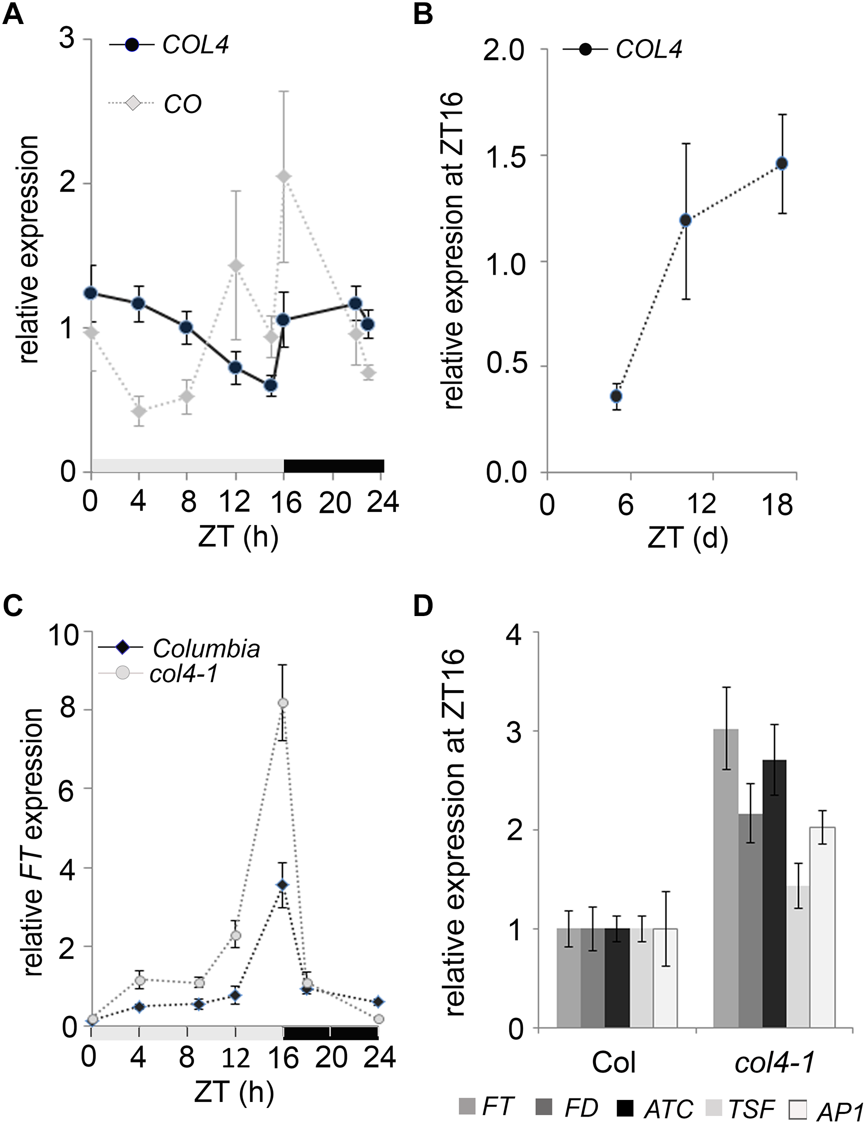 Expression kinetic of COL4. (A) Diurnal gene expression of COL4 and CO in 6-days old wild type Columbia seedlings (n ≥ 20) grown in LD. Shown are relative expression values ± S.E. of quantitative RT-PCR (RT-qPCR) analysis. Light gray bar – light period; dark gray bar – dark period. (B) Kinetic of COL4 expression in 5 to 18-days old wild-type Columbia seedlings grown in LD. Samples were harvested at ZT16. Shown are relative expression values ± S.E. (n ≥ 20 seedlings). (C) Diurnal FT expression in 6-days old seedlings of Columbia and col4-1 mutant grown in LD. gray bar – light period, black bar – dark period. Shown are relative expression values ± S.E. (n ≥ 20 seedlings). Light gray bar – light period; dark gray bar – dark period. (D) Gene expression of FT, ATC, TSF, and FD and the direct FT target genes AP1 at ZT16 in 10-days old seedlings of Columbia and col4-1 grown in LD. Shown are relative expression values ± S.E. of RT-qPCR analysis (n ≥ 20 seedlings). The graphs represent the mean of at least two experiments.
