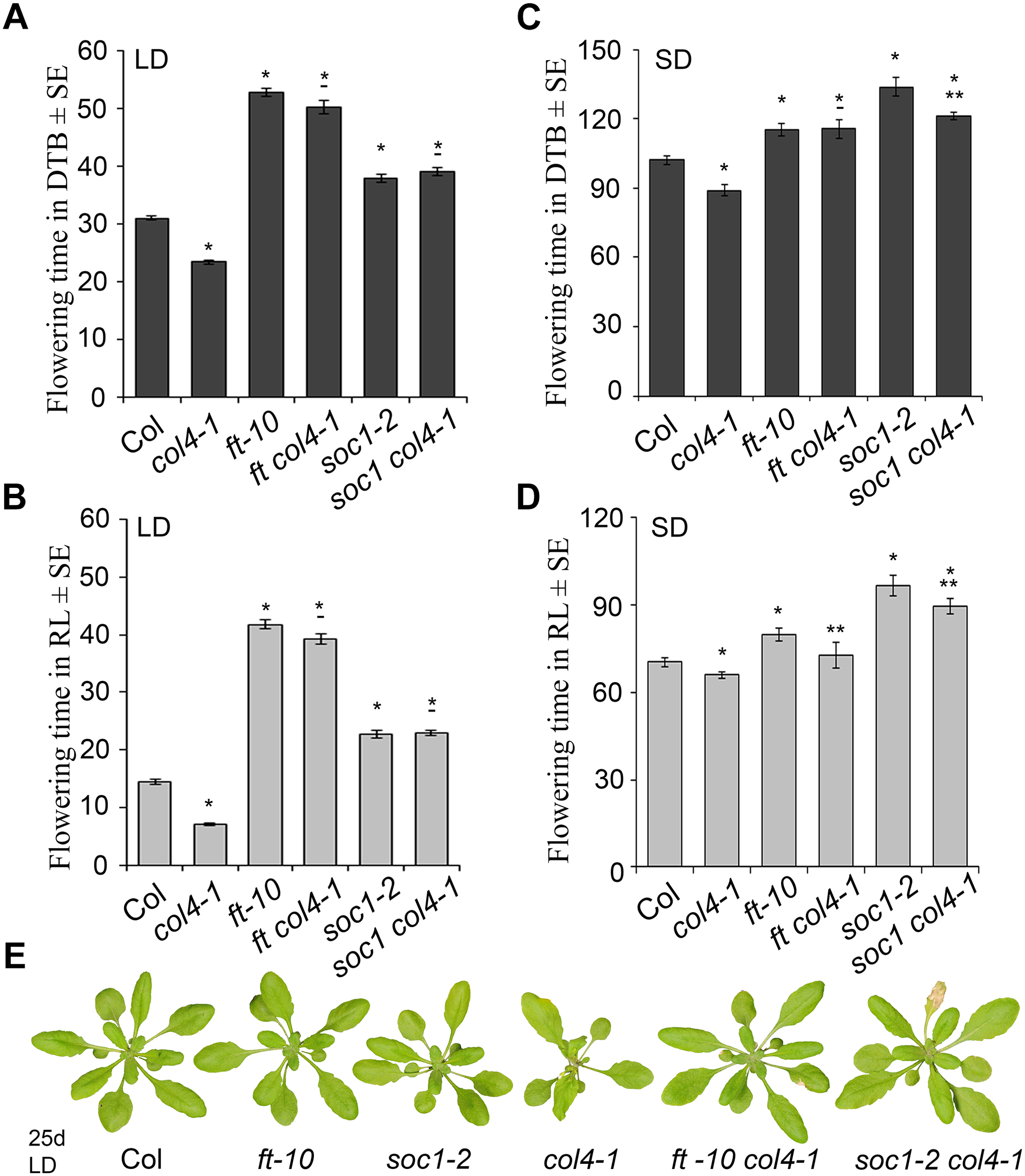COL4 functions upstream of FT and SOC1. (A–D) Flowering time of the double mutants ft-10 col4 and soc1 col4 in LD (A,B) and SD (C,D) expressed in DTB and RL. Shown are mean values ± S.E. ∗ = p-value < 0.05 to Col, ∗∗ = p-value < 0.05 to corresponding late flowering single mutant. – = no significant difference to corresponding late flowering single mutant. (E) Phenotype of the single and double mutants grown for 25 days in LD, at the time point when col4-1 flowered. All graphs represent the result of one out of at least two experiments with the same outcome.
