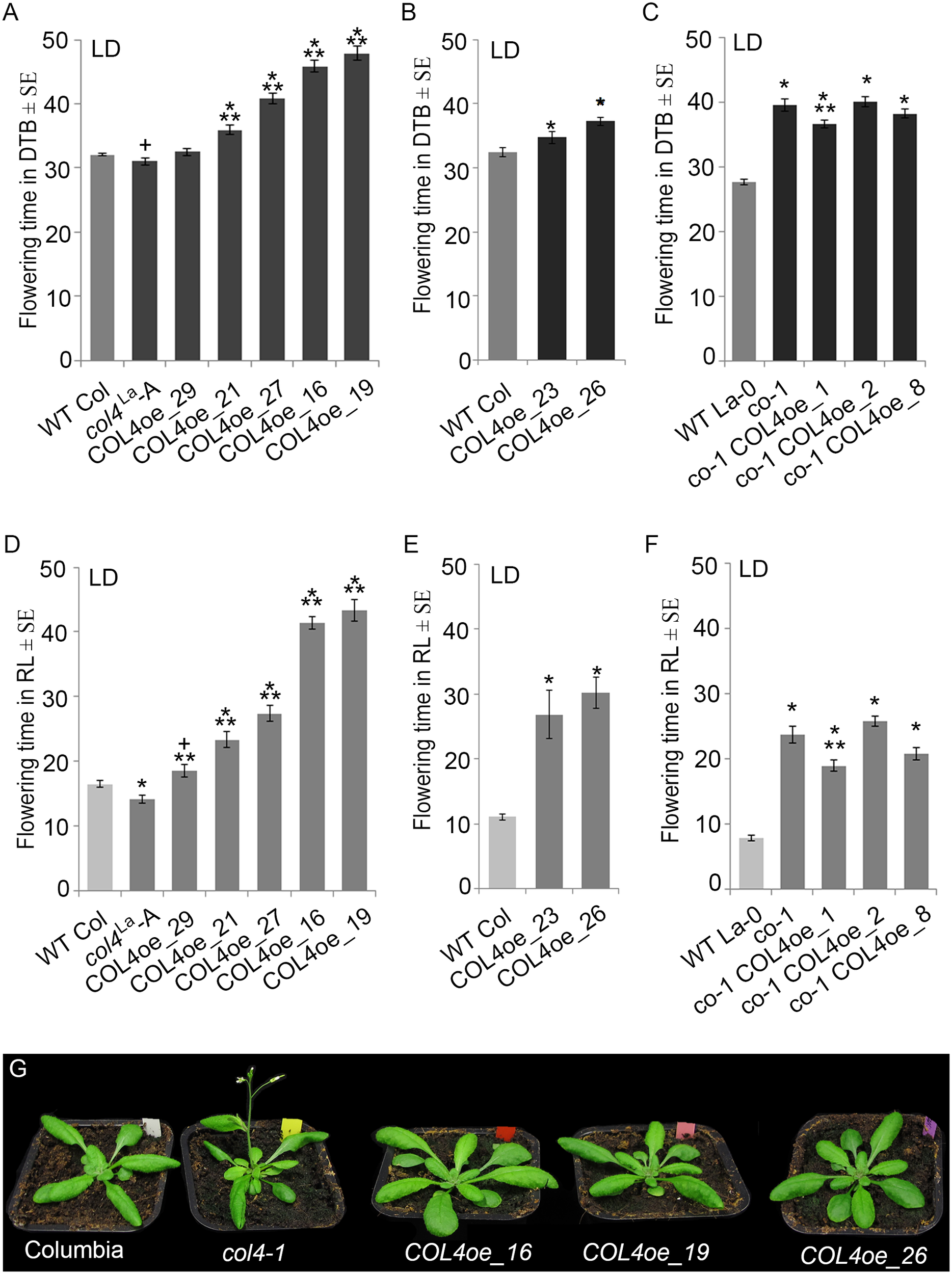 COL4 overexpression delays flowering time. (A–F) Flowering time analysis in LD of independent transgenic lines overexpressing COL4 in the col4La Columbia allele (COL4-oe). The graphs show two experiments including the independent COL4oe-lines -16, -19, -21, -27, -29 (A,D) and the independent COL4oe-lines -23, -26 (B,E). (C,F) Flowering time analysis of independent transgenic lines overexpressing COL4 in the mutant co-1 (co-1 COL4-oe) in LD. Shown are DTB (black bars) and rosette leave numbers (RL, gray bars) at flowering ± SE (n ≥ 14 plants). Shown are mean values + S.E., p-value < 0.05 to WT (∗) or corresponding single mutant (∗∗), p-value < 0.1 to WT (+). (G) Plant phenotype of the single mutant and COL4oe lines grown in LD, at the time point when col4-1 flowered.