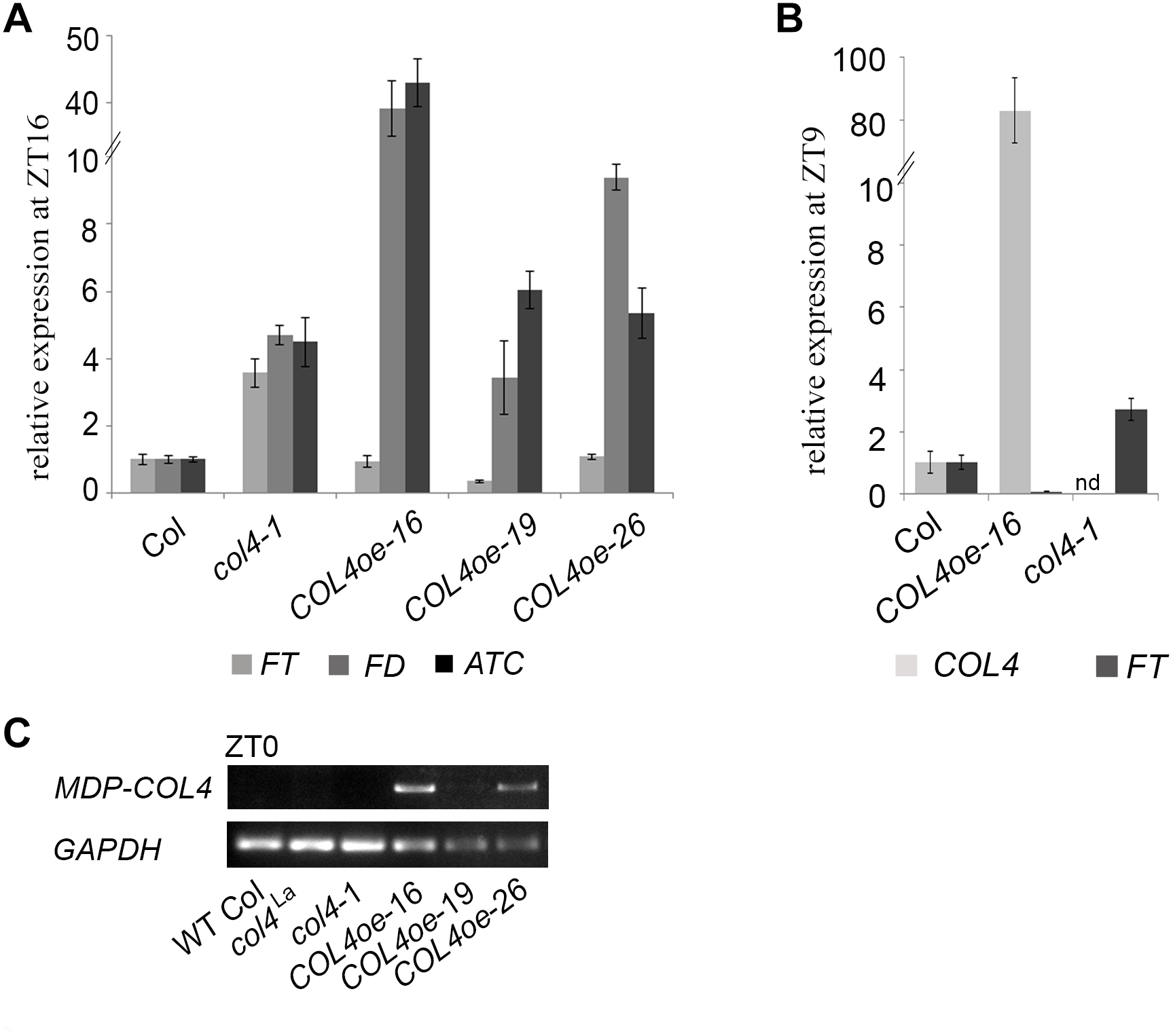 COL4 overexpression modifies expression of key flowering time genes. (A–B) Gene expression of key flowering time genes in 24-days old Columbia, col4 mutant plants and independent COL4-oe lines, grown in LD. Expression of the genes FT, ATC, and FD at ZT16 (A) and of FT, COL4 after 9 h light period (ZT9) (B) was analyzed by using RT-qPCR. Five plants per independent line were pooled. Dash numbers represent individual transgenic COL4 over-expression lines. nd – not determined. Shown are relative expression values ± S.E. All graphs represent the result of at least two experiments. (C) Gene expression of COL4 at the end of night (ZT0) in 24-days old Columbia, col4 mutant plants and independent COL4-oe lines, grown in LD. Expression analysis was performed by semiquantitative PCR.