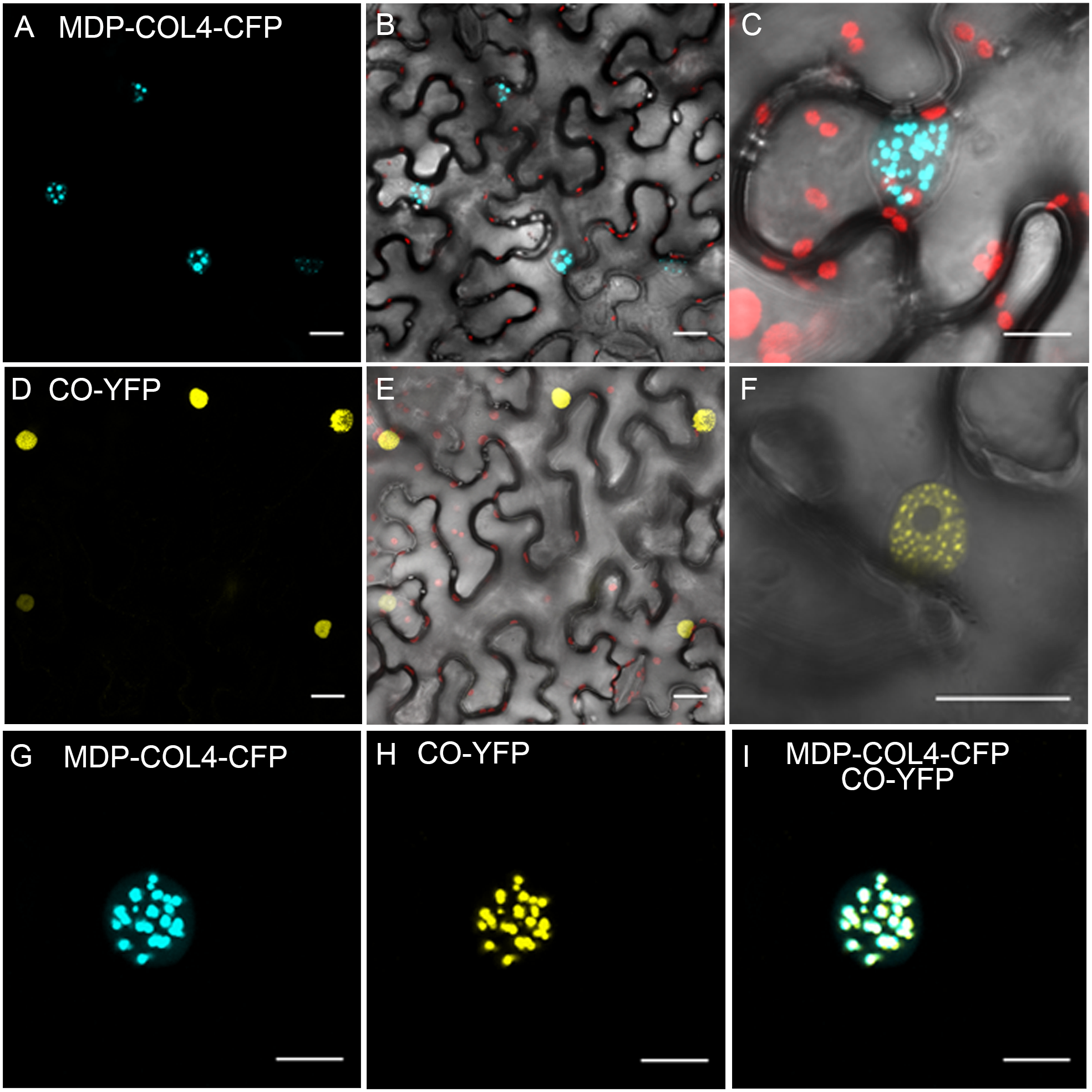 Co-localization of COL4 and CO in the nucleus. (A–C) MDP-COL4-CFP localization. (A) MDP-COL4-CFP fluorescence (blue) in the nuclei. (B) Merge of (A), chlorophyll auto-fluorescence (red) and bright-field. (C) Zoom to one nucleus: Merge of MDP-COL4-CFP fluorescence, chlorophyll and bright-field. (D–F) CO-YFP localization. (D) CO-YFP fluorescence (yellow) in the nuclei (E) Merge of (D), chlorophyll auto-fluorescence (red) and bright-field. (F) Zoom to one nucleus: Merge of CO-YFP fluorescence and bright-field. (G–I) The co-localization of MDP-COL4-CFP and CO-YFP in the nucleus: MDP-COL4-CFP fluorescence (G), CO-YFP fluorescence (H) and (I) merge of (G) and (H). Scale bars: 20 μm. Shown are images of tobacco leaf cells transiently expressing the respective fusion proteins.