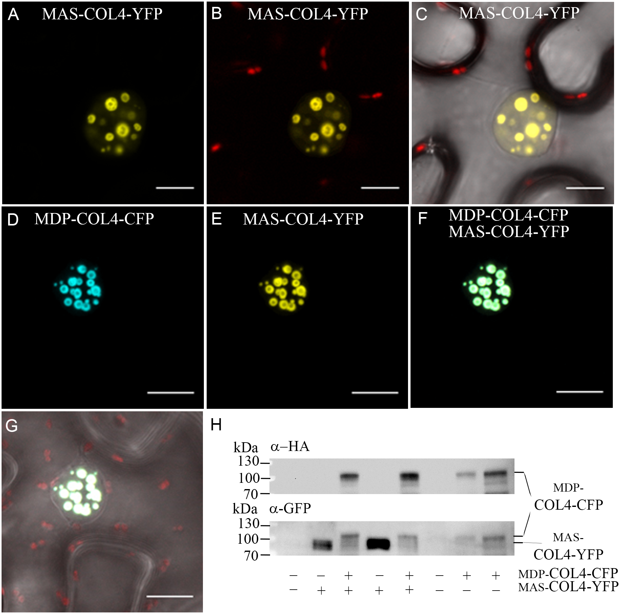 Co-localization of MDP-COL4 and MAS-COL4 in the nucleus. (A–D) Co-localization of MDP-COL4-CFP and MAS-COL4-YFP in the nucleus. (A) MAS-COL4-YFP fluorescence (yellow) in the nuclei. (B) Merge of (A) and chlorophyll auto-fluorescence. (C) Merge of (A), chlorophyll auto-fluorescence (red) and bright-field. (D) MDP-COL4-CFP fluorescence (blue). (E) MAS-COL4-YFP fluorescence in the same nucleus as (D). (F) Merge of (D) and (E). (G) Merge of (F), chlorophyll auto-fluorescence (red) and bright-field. Shown are images of tobacco leaf cells transiently expressing the respective fusion proteins. Scale bars: 20 μm. (H) Immunoblot analysis of transiently expressed COL4 proteins in N. benthamiana leaves. MDP-COL4-CFP carried the full length COL4, a HA- and CFP fusion tag. MAS-COL4-YFP carried the truncated COL4 from the 2nd translational start site (ATG2) and a YFP fusion tag.