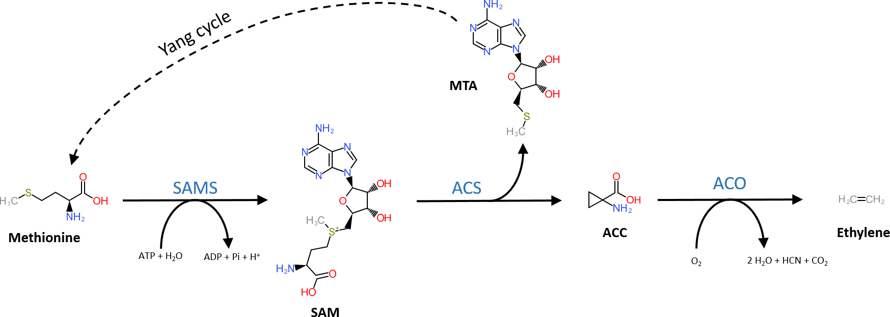Figure 1. Structural representation of the ethylene biosynthesis pathway. Methionine is converted into SAM by SAM synthetase (SAMS) requiring ATP. Next, SAM is converted into methylthioadenosine (MTA) and 1-aminocyclopropane-1-carboxylic acid (ACC) by ACC-synthase (ACS). MTA is recycled back to methionine by the Yang-cycle (several reactions depicted by the dotted line). In the final step, ACC-oxidase (ACO) catalyzes the release of ethylene from ACC using molecular oxygen.