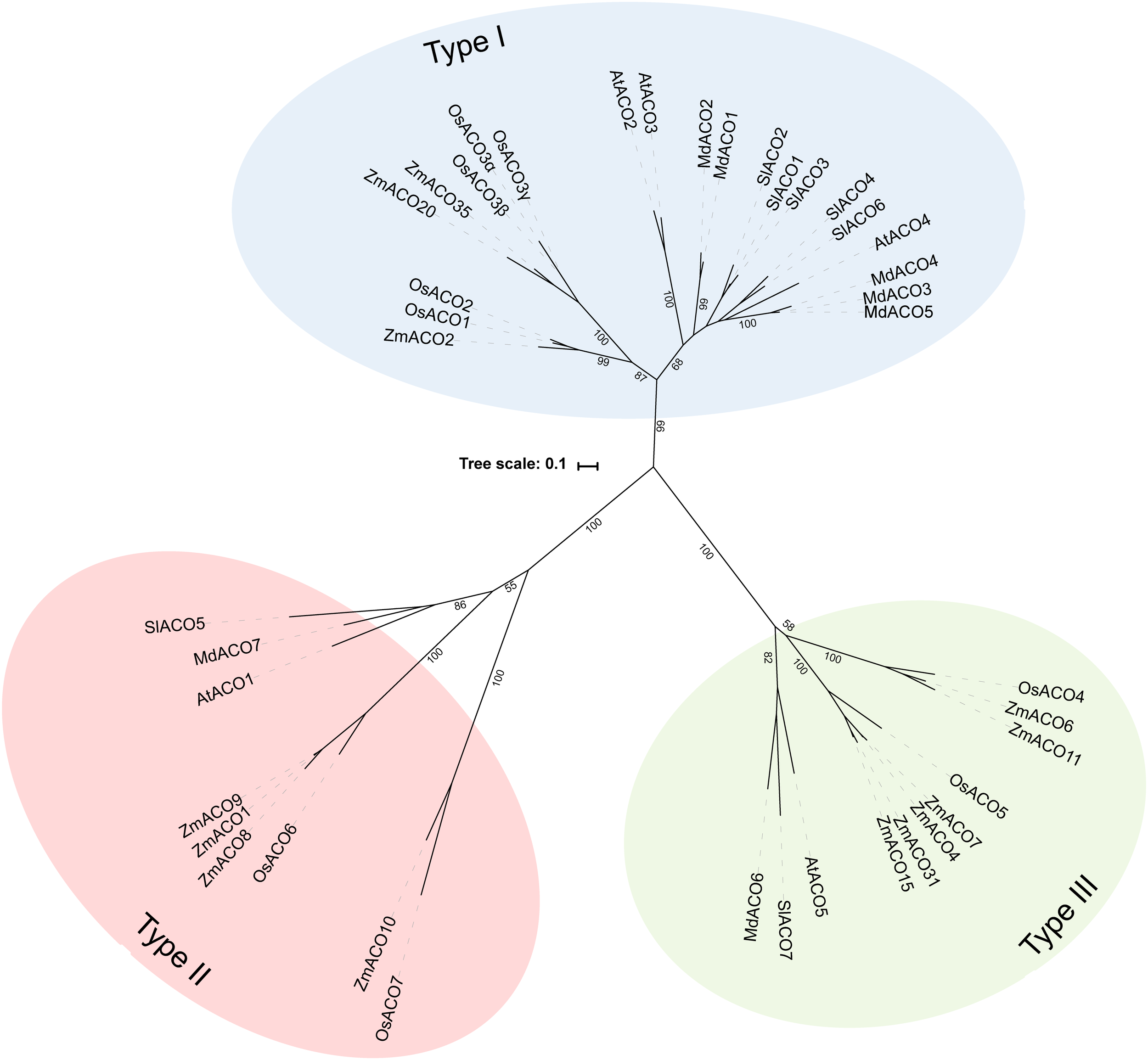Figure 2. Maximal likelihood phylogenetic tree for ACO protein sequences of Arabidopsis thaliana (AT), Tomato (Solanum lycopersicum; Solyc), Apple (Malus domestica; MDP), Rice (Oryza sativa; Os), and Maize (Zea mays; Zm) retrieved from Phytozome (v12.1). Protein sequences were aligned in Geneious (v10.2.2) using the MUSCLE alignment plugin. The phylogenetic tree was build using RAxML (v8.2.11) for best-scoring maximum likelihood tree with rapid bootstrapping (1000 bootstrap replicates). Bootstrap values for the main branches are depicted on the tree. Type I ACO is shown in blue, Type II ACO is shown in red, and Type III ACO is shown in green.
