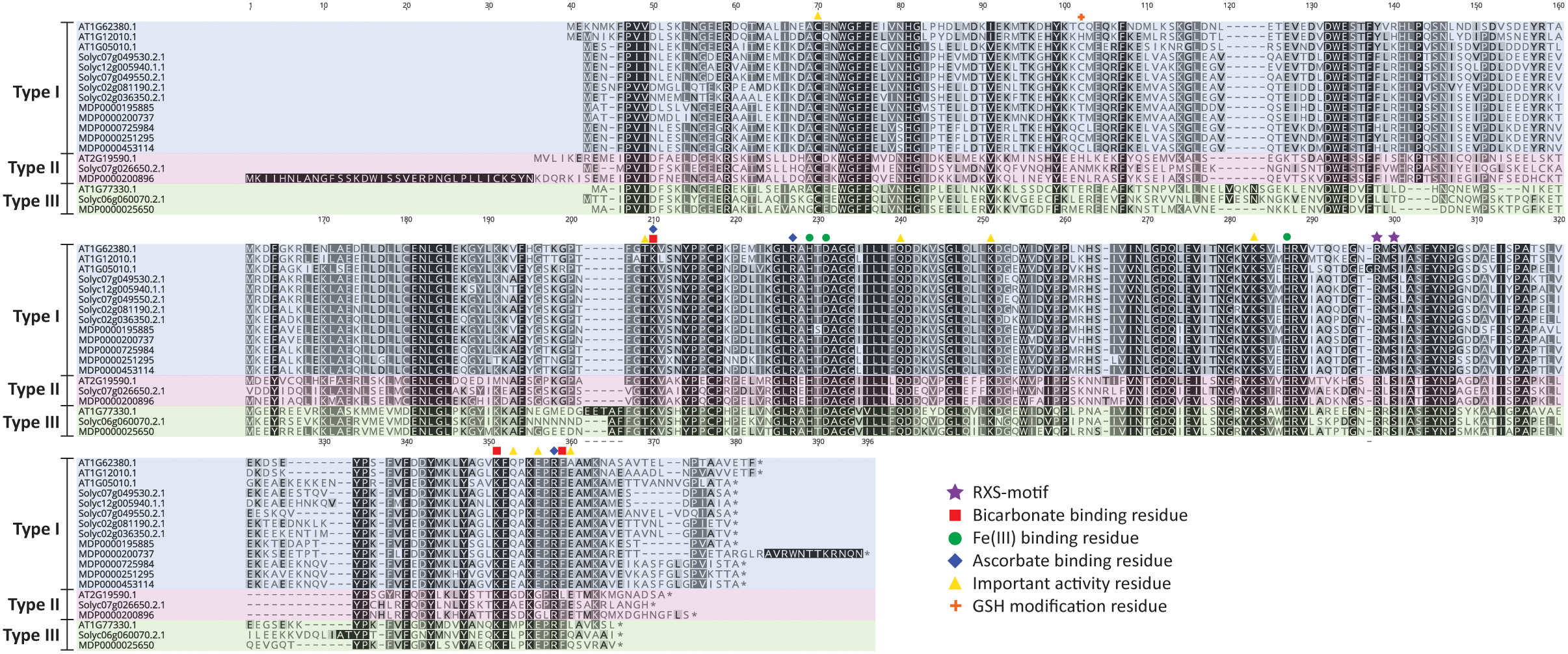 Figure 3. ACO protein sequence alignment of Arabidopsis thaliana, Solanum lycopersicum, and Malus domestica. Protein sequences were aligned in Geneious (v10.2.2) using the MUSCLE alignment plugin. Important residues are marked according to the legend shown. Type I ACO is shown in blue, Type II ACO is shown in red, and Type III ACO is shown in green.
