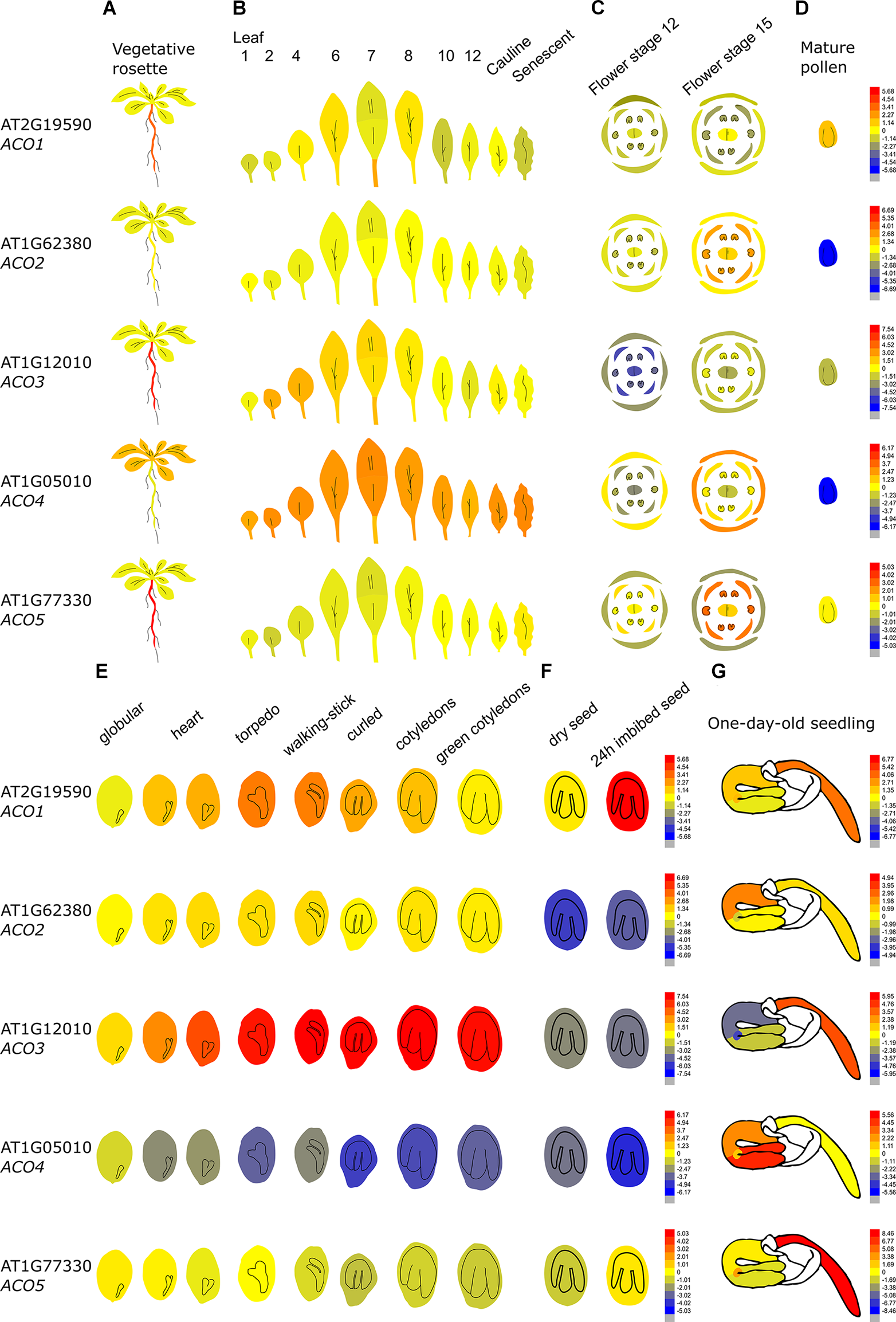 Figure 4. Tissue-specific and developmental expression profiles of the five Arabidopsis ACOs. Data is adapted from the eFP browser. The color scale depicts a Log2 fold expression range (Waese et al., 2017). (A) Expression in the vegetative rosette and the root, (B) the different leaves, (C) the different flowering organs, (D) mature pollen, (E) the different stages of embryogenesis, (F) the dry and imbibed seed, and (G) a 1-day-old seedling (Nakabayashi et al., 2005; Schmid et al., 2005; Klepikova et al., 2016).