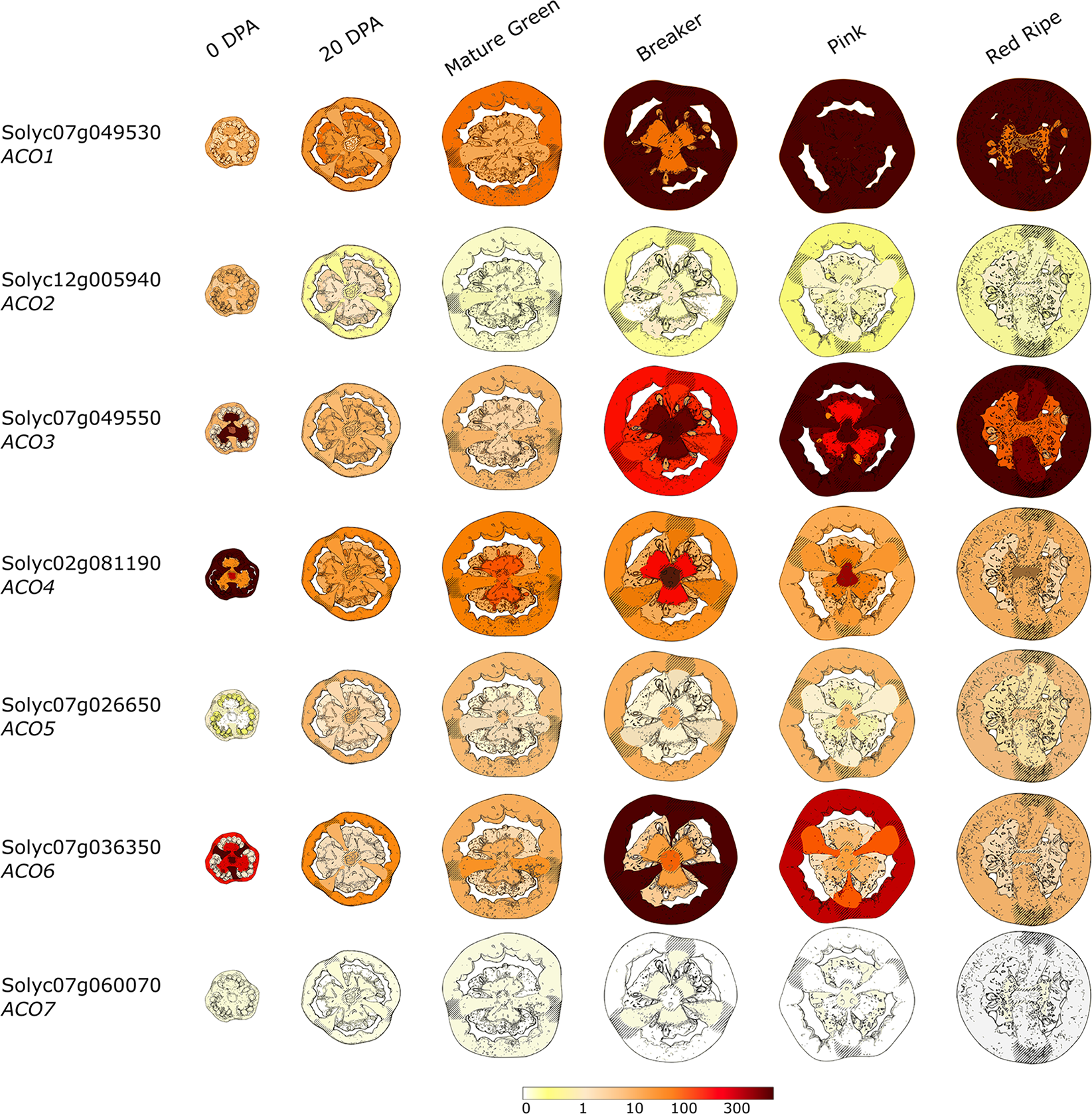 Figure 5. Tissue-specific and developmental expression profiles of the seven tomato ACOs during fruit development and ripening. Data is adapted from the Tomato Expression Atlas (TEA). The color scale depicts the reads per million mapped reads (RPM). Days post anthesis (DPA).