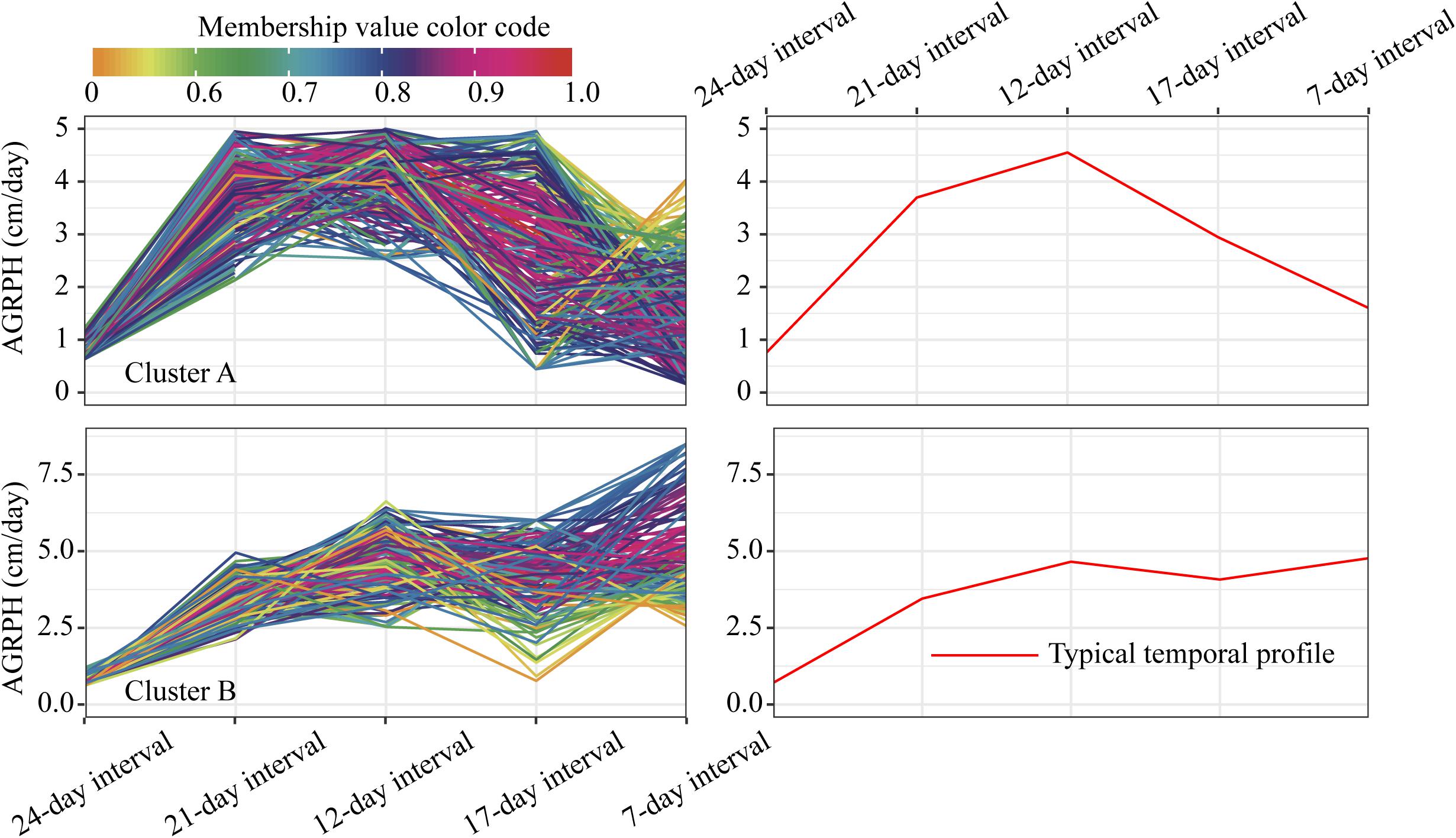 Figure 11. Clustering temporal profiles of AGRPH. Temporal profiles are assigned to clusters A and B by fuzzy c-means clustering. Each trace is color coded according to its membership in the respective cluster (see color bar). The right plot shows a polyline formed joining the clustering centroids at five time points that is used to identify the dynamic pattern of the AGRPH trait. AGRPH, average growth rate of plant height.