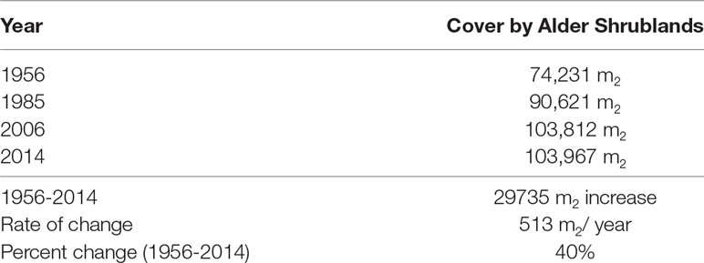 A time series of four cloud-free, high-resolution aerial and satellite images was analyzed using established photo-interpretation methods to determine whether alder shrubland distribution has changed in the last half-century (Lara et al., 2018; Frost et al., 2014). Geospatial image products included: 1) a 1956 panchromatic aerial photograph from USGS, 2) a 1985 color-infrared aerial photograph from the Alaska High Altitude Aerial Photography, 3) a 2006 panchromatic OrbView-3 satellite image, and 4) a 2014 multispectral Worldview-2 satellite image. All images were acquired during mid- to late summer and orthorectified, georeferenced (mean RMS error: 2.5 m), and resampled to 1 m resolution. Alder shrubland patches were digitized manually in each image at a map scale of 1:2,500 in ArcMap GIS (ArcMap 10.6; ESRI, Redlands, CA, USA). This time-series was only able to characterize change in alder shrublands; alder within alder savanna communities do not form homogenous canopies larger than 1 m in diameter and were therefore below the detection limit of the image products.