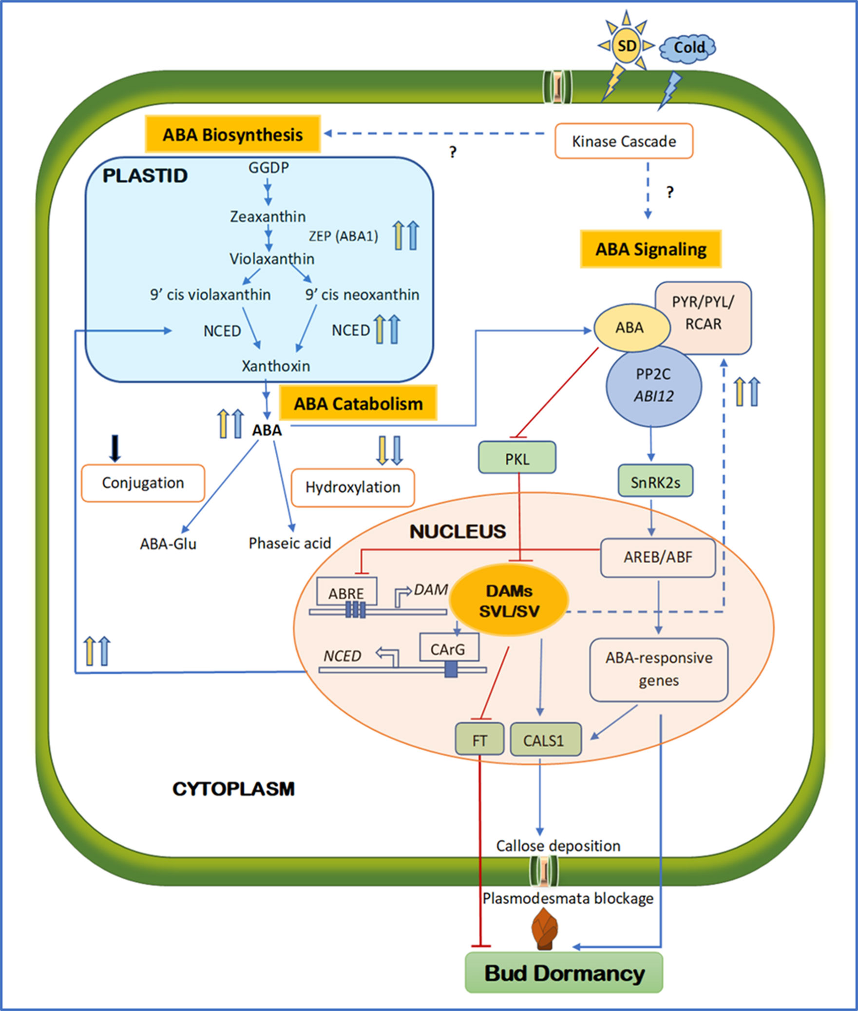 Figure 1 Schematic diagram integrating major components of ABA biosynthesis, signaling, and catabolism during the establishment of bud endodormancy. Solid and dashed lines indicate direct and indirect regulation; respectively. Arrowed blue and barred red lines indicate activation and inhibition, respectively. Upward and downward arrows indicate upregulation and downregulation, respectively. Blue and yellow arrows indicate cold- and SD-mediated activation, respectively, whereas the black arrow indicates an undetermined signal source. Question marks indicate the unconfirmed mechanisms. Towards the end of the growing season, SD photoperiod and short-term low temperature activate both ABA biosynthesis and signaling, possibly via kinase cascades. As a result, the key components in ABA biosynthesis and signaling such as ZEP, NCED, PYR/PYL/RCAR, and PP2C are upregulated, whereas ABA catabolism through hydroxylation or conjugation is downregulated. High ABA levels activate DAM and SVP/SVL transcription factors through repressing PKL. DAM promotes ABA synthesis by binding to the CArG motif of the NCED promoter, whereas SVL enhances ABA signaling by upregulating ABA receptor RCAR/PLY. The positive feedback loop between ABA and DAM/SVL can be balanced by the ABA signaling component ABRE, which represses the activity of DAM by binding to the three ABRE motifs in its promoter region. SVL can induce the expression of CALS1 and FT by binding to their promoters. The ABA signaling pathway can also upregulate CALS1, which in turn produces callose at the plasmodesmata to block the intercellular communication, contributing to the establishment of endodormancy. Activated ABA responses, repressed FT, and callose deposition all lead to the establishment of endodormancy. ABA, abscisic acid; FT, flowering locus T; SD, short day; ZEP, zeaxanthin epoxidase; NCED, 9-cis-epoxycarotenoid dioxygenase; PYR, regulatory pyrabactin resistance; PYL, pyrabactin like; RCAR, components of ABA receptors 1; PP2C, protein phosphate 2C; DAM, dormancy-associated MADS; SVP, short vegetative phase; SVL, SVP-like