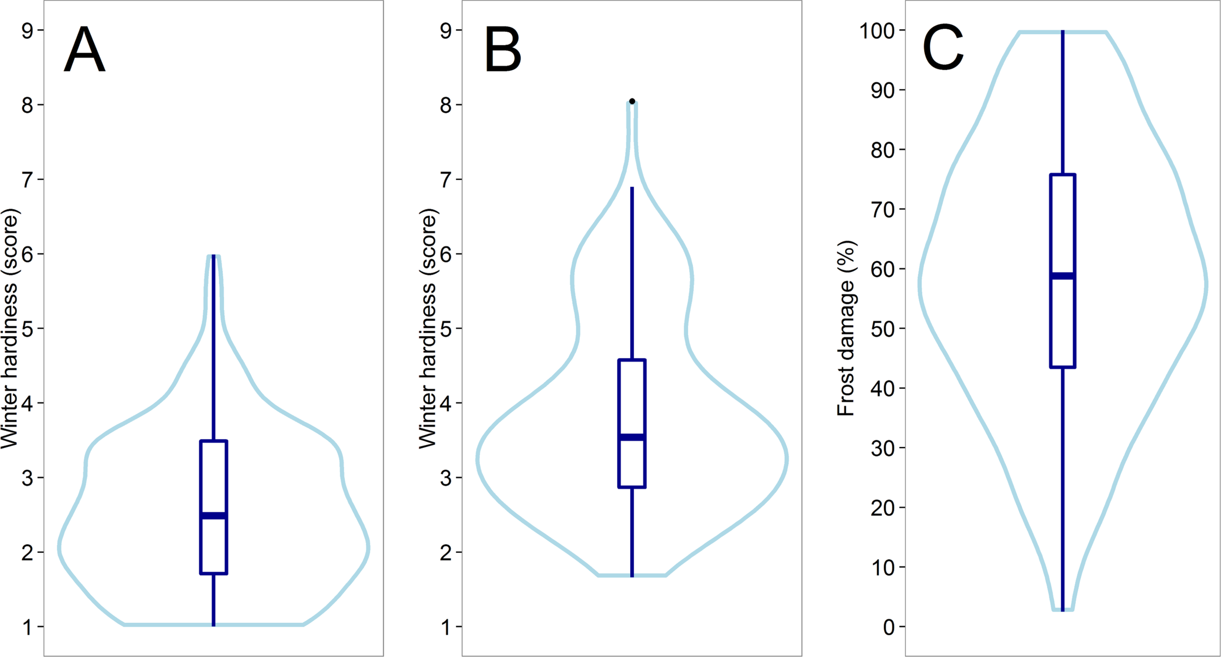 Violin plots showing the distribution of the assessed line performance for winter hardiness in Austria 2012 (A) and Eastern Canada 2018 (B) as well as for the frost tolerance in the climate chamber experiment 2017 (C).