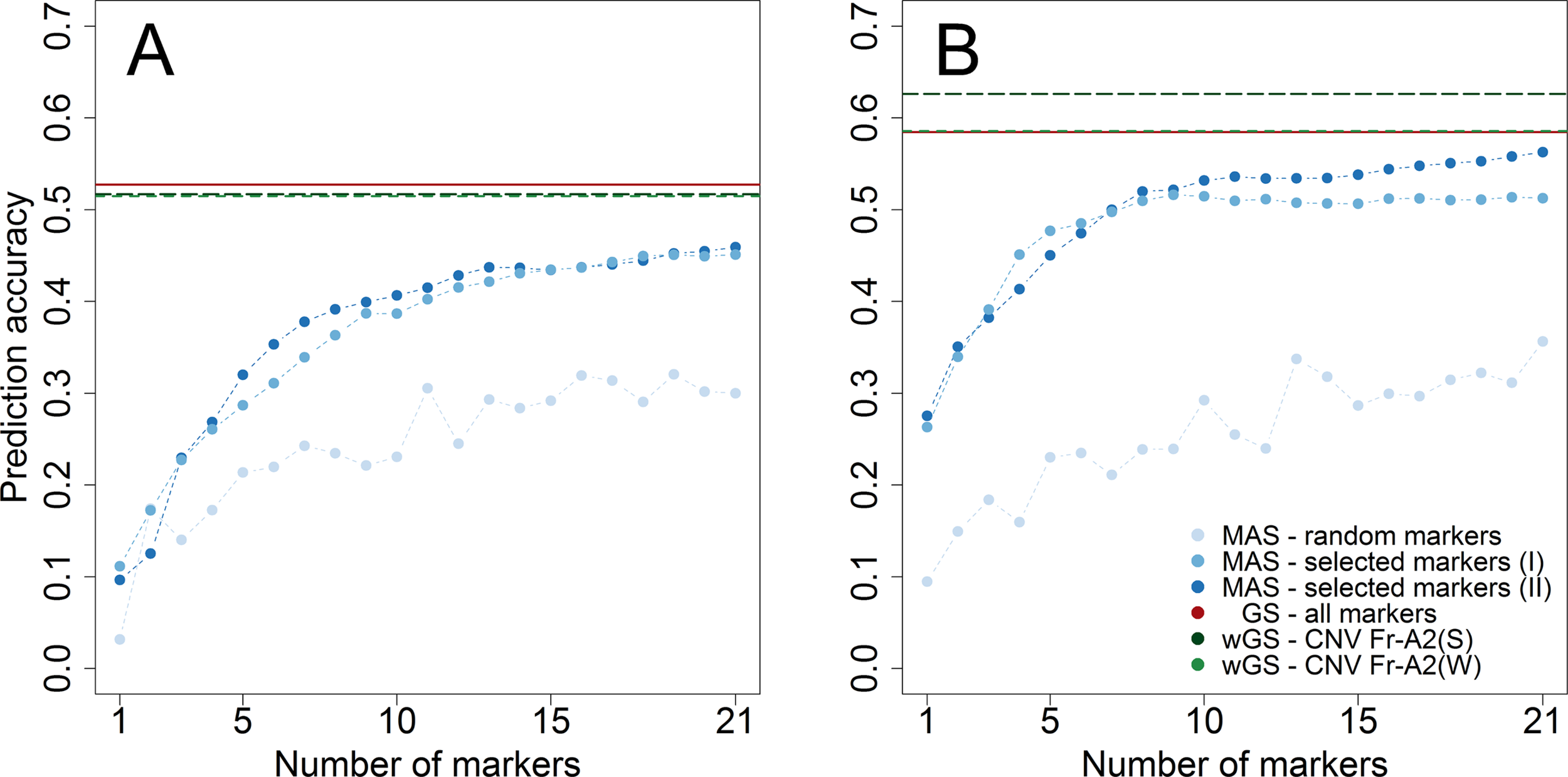 Prediction accuracy assessed by cross-validation within the two subpopulations phenotyped for winter hardiness 2012 (A) and frost tolerance 2017 (B). The number of genome wide (I) and chromosome-wise (II) preselected and randomly chosen markers to train prediction models for marker-assisted selection (MAS) varied between 1 and 21, whereas the merit of genomic selection (GS) was assessed by all markers as well in weighted genomic prediction models (wGS) modelling either the haploblock CNV Fr-A2(S) (Sieber et al., 2016) or CNV Fr-A2(W) (Würschum et al., 2017) as additional fixed effects.