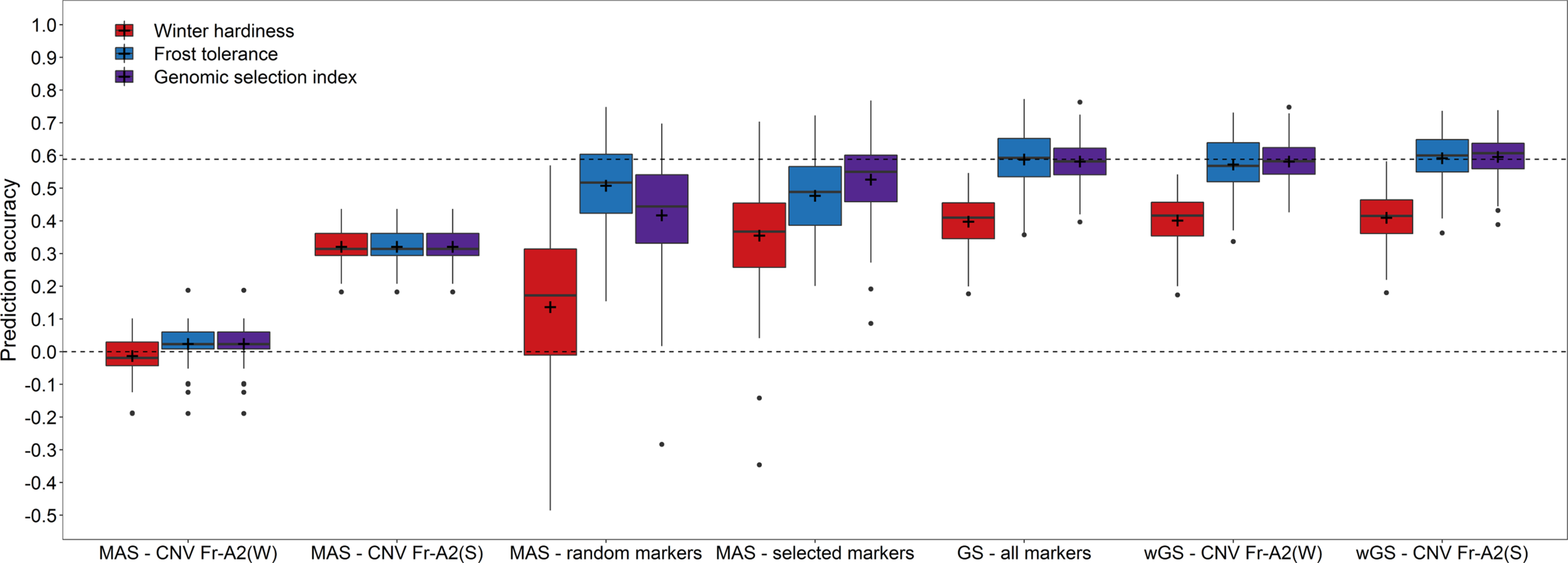 Prediction accuracy for winter hardiness in the independent validation population (2018) using either winter hardiness data (2012) or frost tolerance records (2017) for model training as well as for combining the respective genomic estimated breeding values by a genomic selection index. Prediction models for a marker-assisted selection (MAS) were trained by using only the haploblocks CNV Fr-A2(S) (Sieber et al., 2016) and CNV Fr-A2(W) (Würschum et al., 2017) or a chromosome-wise preselected set of markers, while the models for genomic selection (GS) were based on all genome-wide distributed markers as well as modelling either the haploblock CNV Fr-A2(S) or CNV Fr-A2(W) as additional fixed effects in weighted genomic prediction models (wGS).