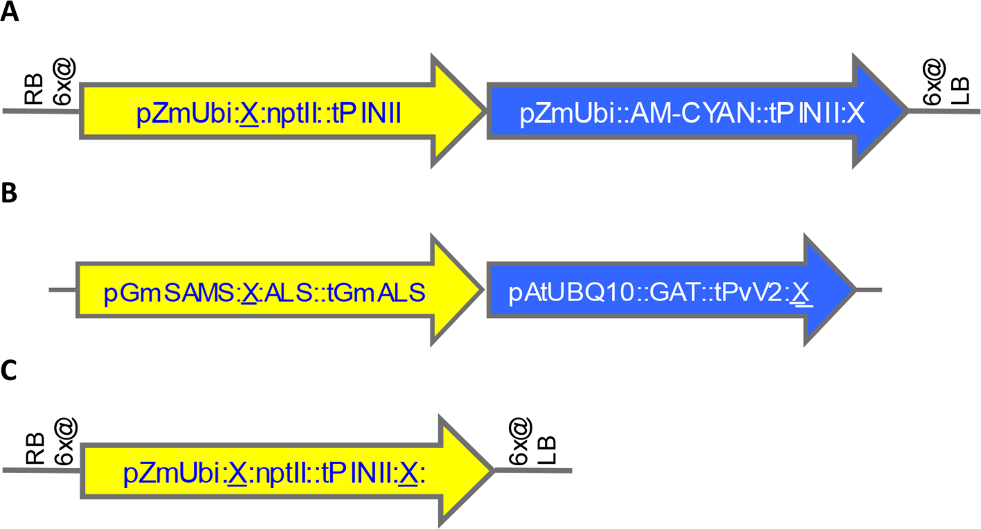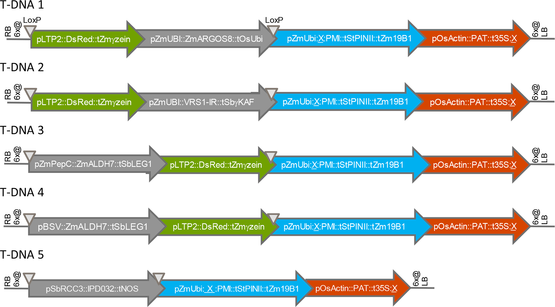 Structures of T-DNA constructs introduced into maize by Agrobacterium transformation. RB, right T-DNA border; LB, left T-DNA border; 6x@, stop codons in all six reading frames; p, promoter element, t, terminator element; ∇, LoxP site; X, FRT site. Arrows indicate the direction of transcription.