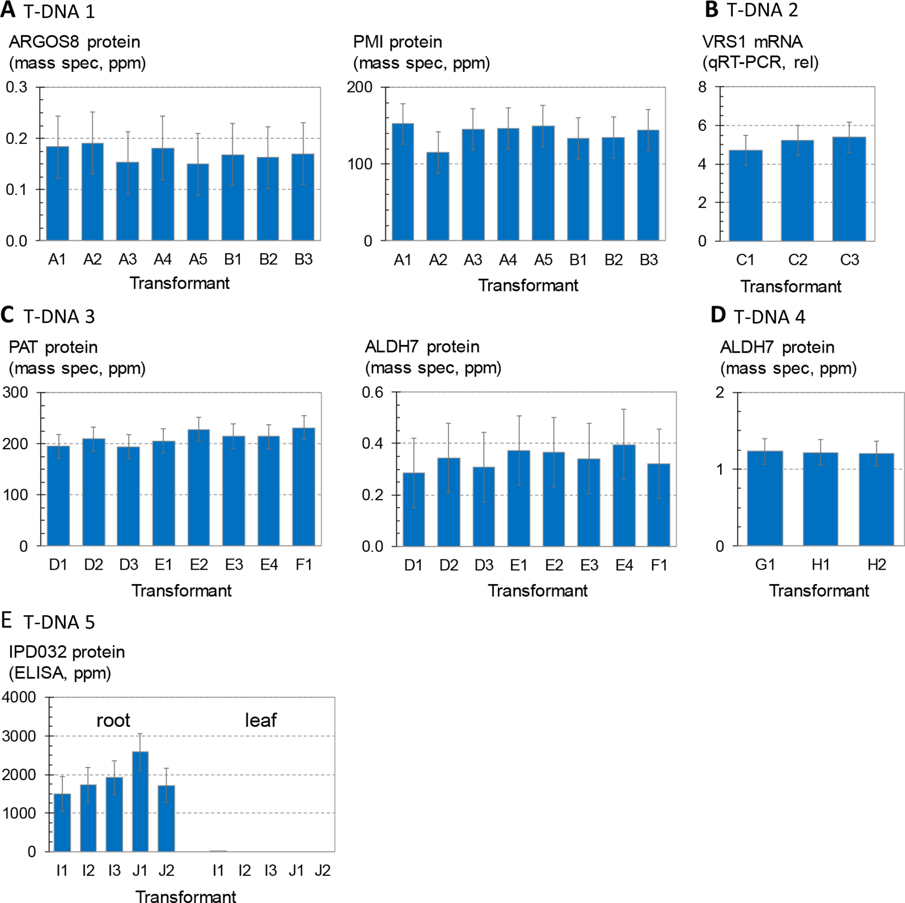 Figure 2A compares expression levels of the maize ARGOS8 transgene, measured as ARGOS8 protein concentration, for a set of eight sister transformants containing T-DNA 1. The mass spectrometry method used here measures recombinant protein concentrations above any background signal attributable to the corresponding endogenous protein (Schacherer et al., 2017). Statistical testing for differences in means across the eight transformants showed no significant differences. Figure 2A also shows PMI protein concentrations measured in the same leaf extracts. PMI protein concentrations were also consistent, and no significant differences in the means were found among the eight transformants either. Figure 2B compares three sister transformants containing the T-DNA 2 insertion, which has the same molecular stack design as T-DNA 1, except for the gene of interest. The gene of interest in T-DNA 2 contains the maize Ubi promoter and first intron driving an inverted repeat of a fragment of the maize VRS1 gene. Transcript levels from this VRS1 inverted repeat in leaf extracts were consistent, with no significant differences in mean transcript levels across the three sister transformants. Figure 2C shows the concentrations of PAT and ALDH7 proteins in leaf extracts of eight sister transformants from three transformation experiments introducing T-DNA 3. The mean concentrations across all eight events were not significantly different for either protein. Figure 2D summarizes ALDH7 protein concentrations in leaf extracts from three transformants with the strong, constitutive viral promoter BSV driving transcription of the ALDH7 CDS (T-DNA 4). The concentrations of ALDH7 protein in these three events from two transformation experiments were almost identical. The chart in Figure 2E shows IPD032 protein concentrations in leaf and root extracts from young maize plants transformed with T-DNA 5. The IPD032 coding sequence is under the transcriptional control of the root-specific promoter RCC3. The IPD032 protein was not detected in leaf extracts, as expected for a root-specific promoter. The mean concentration of IPD032 in root extracts ranged from about 1,500 to 2,500 ppm across the five sister transformant lines (CV 22%). IPD032 concentrations in root extracts were not significantly different (95% CI) between four of the five events, but events I1 and J1 were significantly different from each other by a factor of about 1.6X (CI 1.05–3.0).