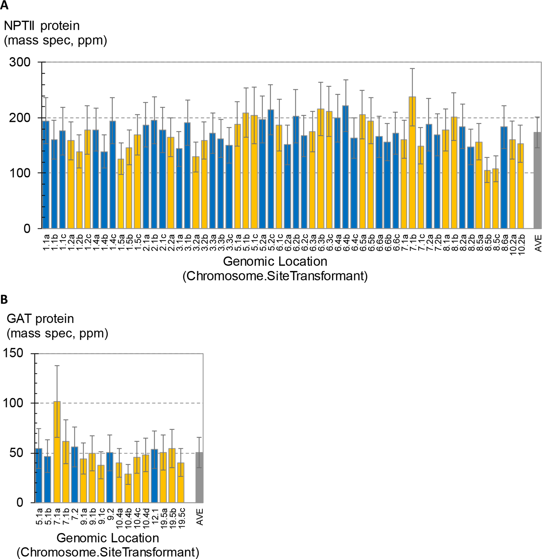 Measurement of transgene expression levels in transformants generated by site-specific integration (SSI). One to four independent SSI events were characterized at each genomic insertion site. The x-axis labels indicate the chromosome number followed by site number (arbitrary) and ending with a small case letter to identify independent events at the same site (a–d). Error bars on blue and gold bars indicate 95% confidence intervals. Gray bars indicate average ± standard deviation of all events. (A) Concentrations of NPTII protein in leaf extracts from 58 independent maize transformants were measured by mass spectrometry. Results from 840 plants are summarized; each bar is the mean of 10–16 plants. (B) Concentrations of GAT protein in leaf extracts from 17 independent soybean SSI transformants. Results from 167 plants are summarized; each bar is the mean of 9–10 plants.