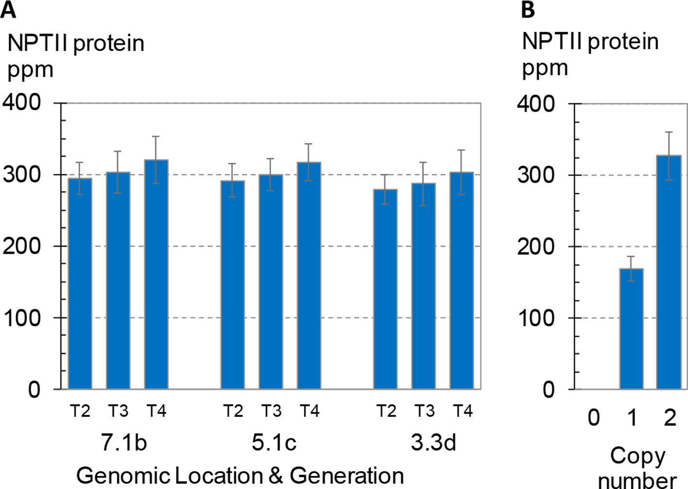 As shown in Figure 5A, no significant differences in NPTII protein concentrations were observed across the three generations homozygous for one of three transgenic insertions. The average NPTII protein concentration for the nine means (3 sites x 3 generations) was 299 ± 13 ppm (CV 4.4%). A fourth transformant line segregating a transgenic insertion with the same nptII cassette was included in the study as a reference. This transformant was created by direct insertion of the SSI landing site using CRISPR-Cas technology (Cigan et al., 2016) and has the insertion structure shown in Figure 3C. Figure 5B shows the mean NPTII protein concentrations of hemizygous and homozygous segregants for this CRISPR-Cas9-derived SSI line. Mean concentrations of NPTII protein in leaf extracts measured by mass spectrometry were 169 and 327 ppm in nptII-hemizygous and -homozygous plants, respectively, demonstrating linear dependence of NPTII protein concentration on transgene dosage. Taken together, these results demonstrate consistent, dose-dependent expression of NPTII across three generations of three transgenic lines homozygous for the transgene.