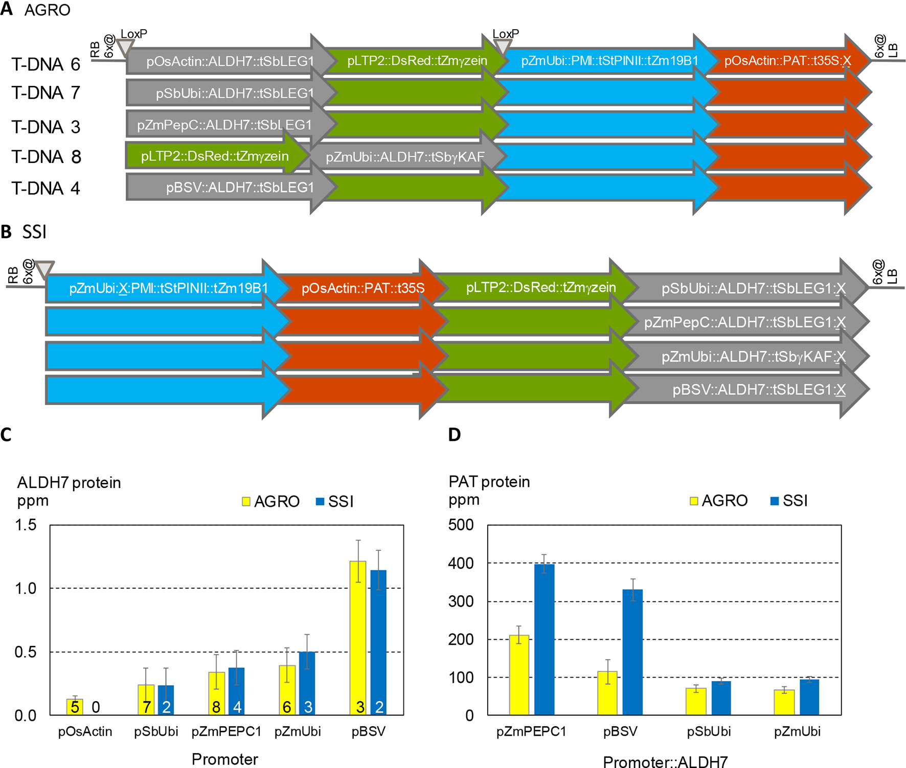 ALDH7 expression levels were attributable primarily to the promoter driving ALDH7 and not to the relative position of the ALDH7 cassette within the transgenic construct. By contrast, PAT protein concentrations were highly influenced by the location of the PAT cassette within the random and targeted molecular stacks (Figure 6D). The concentration of PAT protein in leaf extracts was significantly higher for all SSI constructs compared to the corresponding T-DNA constructs. Moreover, when the promoter in the ALDH7 cassette was the maize PEPC promoter or the viral BSV promoter, PAT protein levels were about 2X and 3X higher, respectively, compared to the corresponding Agrobacterium constructs. These results illustrate that construct design is an important determinant of transgene expression, including both the promoter driving the transgene of interest and seemingly minor details, such as the promoter driving a transgene separated from the gene of interest by two expression cassettes. In contrast, we could detect no impact from genomic location for these promoters tested, even comparing multiple molecularly identical transformants generated through SSI with similar transformants randomly integrated throughout the maize genome.