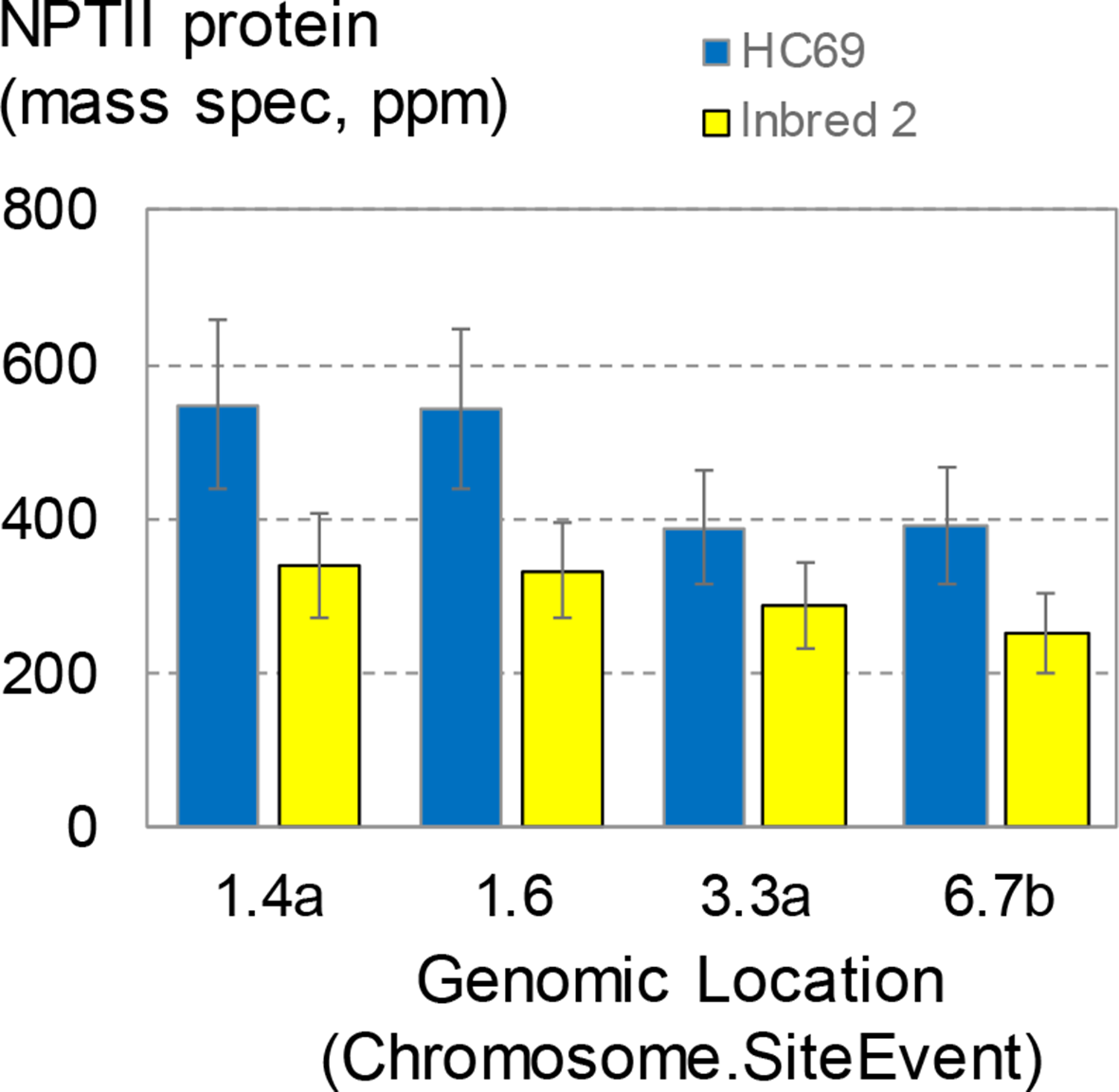 The transgenic maize transformants described so far, including the SSI events, were generated in maize inbred HC69. This inbred was first used as a parent for commercial hybrid seed production in the 1980s. With the goal to establish SSI in a more commercially relevant inbred, designated here as inbred 2, a set of four SSI landing sites in the HC69 genetic background were introgressed by backcrossing to inbred 2. Finished inbred conversions contained >95% inbred 2 (recurrent parent) DNA. Seeds homozygous for the selected SSI landing sites and in the two genetic backgrounds were generated side by side in the field. The four SSI transformants were molecularly identical based on qPCR and SbS analyses. The expression of the nptII transgene at the four insertion sites in the two genetic backgrounds was measured in young leaf tissue following the standard protocol (Figure 8). NPTII protein concentrations in young leaves ranged from ∼390 to ∼550 ppm in HC69. The same SSI landing sites introgressed into a different genetic background (inbred 2) accumulated NPTII protein to consistently lower concentrations, with means ranging from ∼250 to ∼340 ppm in young leaves. For three of the four SSI landing sites analyzed, NPTII protein concentrations in HC69 were significantly higher (∼1.6X) compared to the corresponding inbred 2 conversion. By contrast, the highest and lowest expressing SSI transformants in HC69 differed by a factor of ∼2X (Figure 4A). Although expression levels among the four sites were not significantly different within each inbred, the same pairs of sites supported higher (1.4, 1.6) and lower (3.3, 6.7) transgene expression levels in both genotypes. This result is consistent with small position effects on transgene expression level.