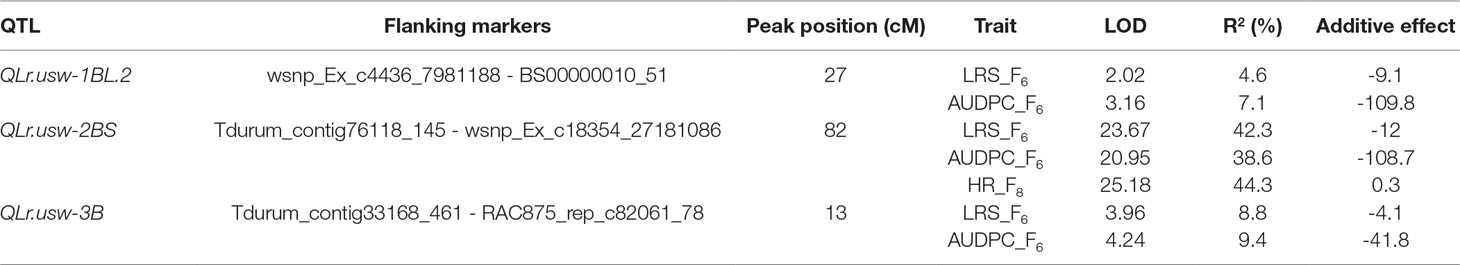 Three QTL controlled leaf rust resistance in the Saragolla/ATRED #2 population, which were detected by CIM on chromosomes 1BL, 2BS, and 3B (Table 5). QLr.usw-2BS peaked at 82 cM on chromosome 2B with wsnp_Ex_c18354_27181086 being the most significant marker linked to this major QTL. QLr.usw-2BS explained up to 42.3% of the final leaf rust severity variance, and was the only QTL detected for the host reactions of the F8 RILs with a LOD score of 25.18. QLr.usw-3B peaked at marker RAC875_rep_c82061_78 on chromosome 3B and accounted for 9.4% of the AUDPC variance. The minor QTL on the long arm of chromosome 1B, designated as QLr.usw-1BL.2, was flanked by markers wsnp_Ex_c4436_7981188 and BS00000010_51, and explained up to 7.1% of the observed variance for AUDPC (Table 5).