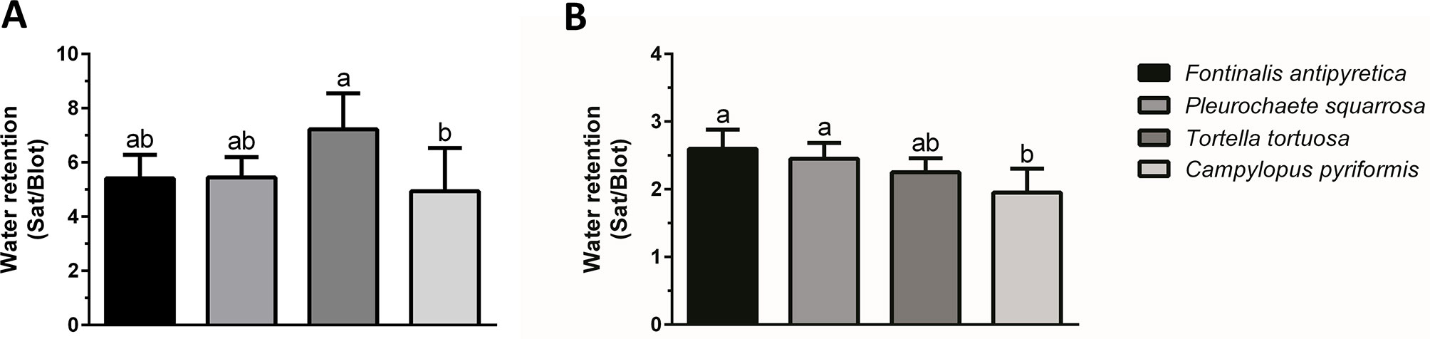 Figure 1 External water retention (saturated weight/blotted weight) at (A) individual shoots and (B) colony level in aquatic bryophyte (Fontinalis antipyretica Hedw.) and three terrestrial bryophytes (Pleurochaete squarrosa (Brid.) Lindb., Tortella tortuosa (Hedw.) Limpr., and Campylopus pyriformis (Schultz) Brid.). Different letters represent significant statistical differences (n = 3).