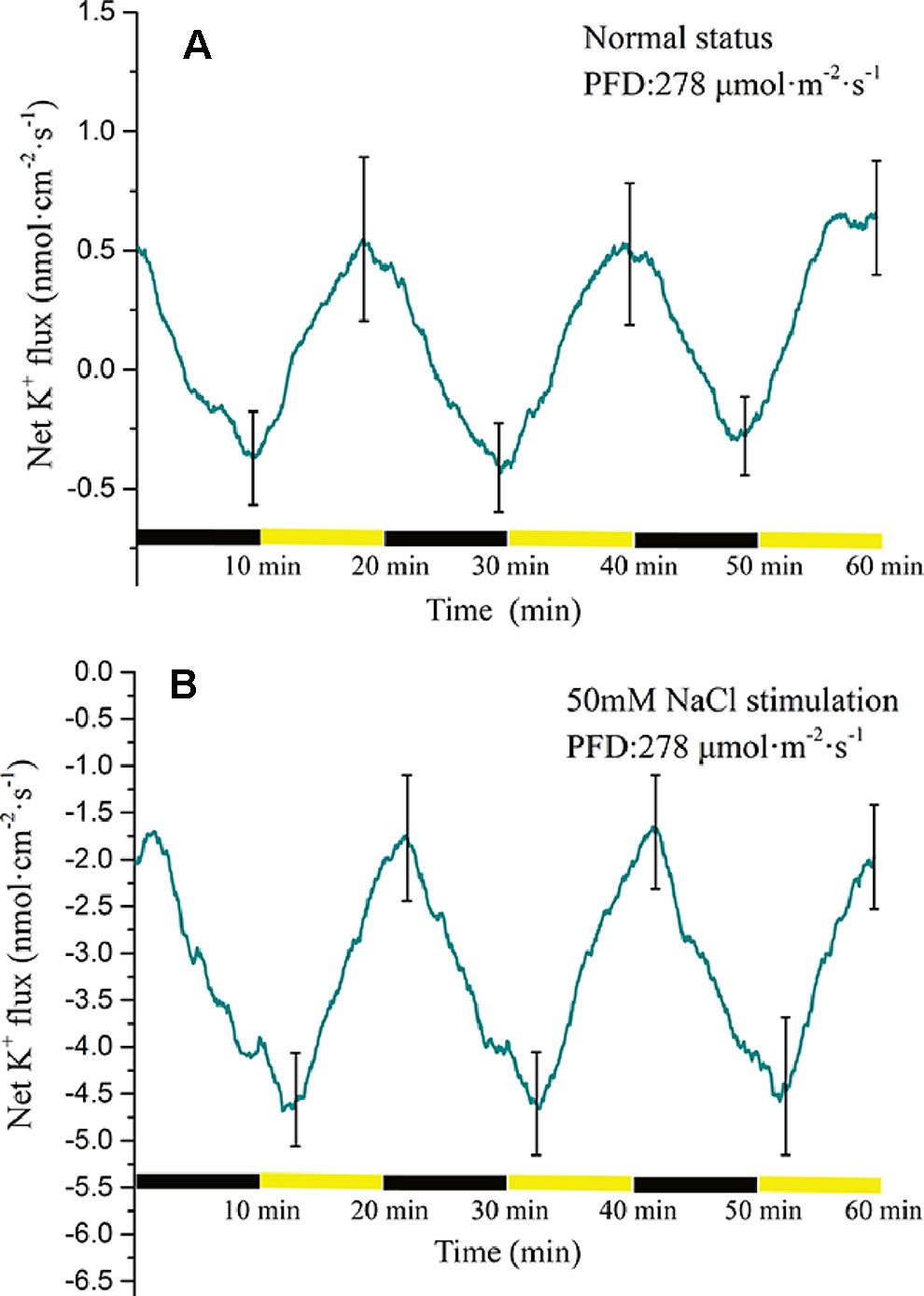 Figure 7 Measurement of net K+ flux before and after 50 mM NaCl stimulation. (A) Net K+ flux induced by periodic illumination/darkness without NaCl treatment (normal condition). (B) Net K+ flux induced by periodic illumination/darkness with 50 mM NaCl stimulation. The duration of net K+ influx significantly increased after 50 mM NaCl stimulation. Negative values represent ion efflux. Note: wavelet decomposition was applied to the raw K+ flux data to remove noise using the Daubechies (db4) wavelet transform, where wavelet layer number was 2–4. Mean ± SE (n = 4); n—number of seedlings.