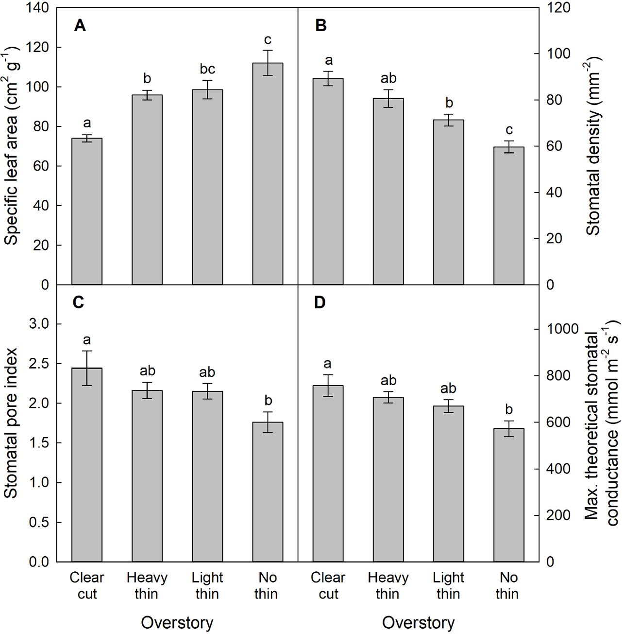 Figure 5 Mean (± SE) (A) specific leaf area (cm2 g−1), (B) stomatal density (stomata mm−2), (C) stomatal pore index, and (D) maximum theoretical stomatal conductance (gmax, mmol m−2 s−1) of Quercus virginiana seedlings planted in clear-cut, heavy thin, light thin, or no thin plots. Different letters indicate significant differences among treatments (α = 0.05).