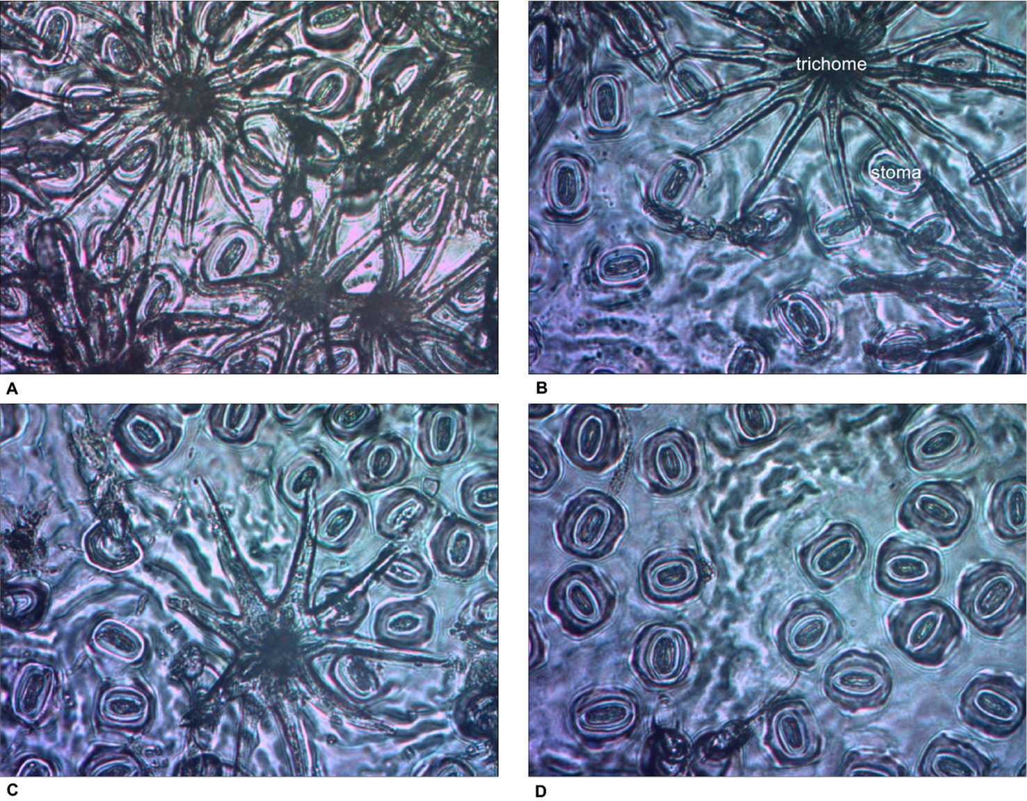 Figure 6 Impression images of abaxial trichomes Quercus virginiana seedlings planted in each of the overstory treatments [(A) clear-cut, (B) heavy thin, (C) light thin, and (D) no thin].