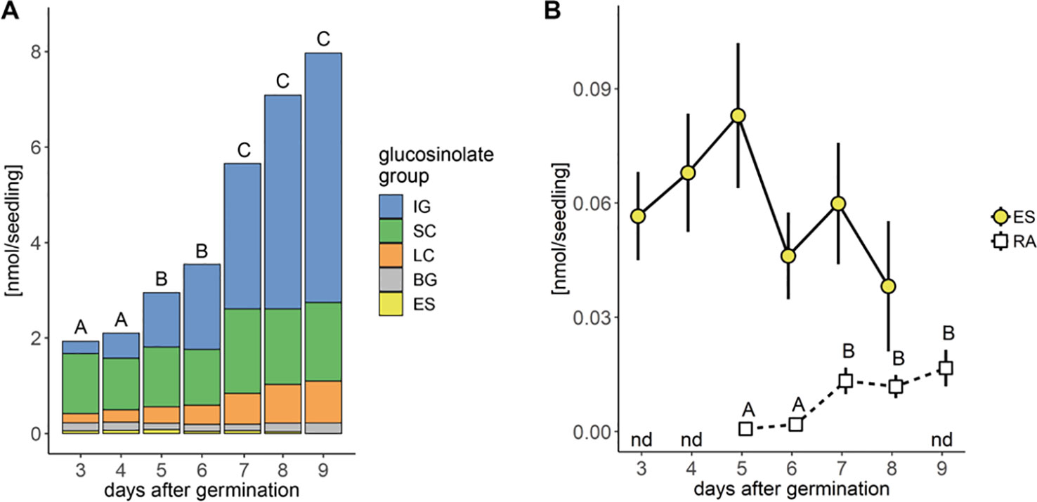 Figure 2 Glucosinolate accumulation during A. thaliana Col-0 seedling development. (A) Plotted are means (N = 6–18, one experimental round) of glucosinolate classes: IG, indolic glucosinolates; SC, short-chain aliphatic glucosinolates; LC, long-chain aliphatic glucosinolates; BG, benzenic glucosinolates; ES, embryo-synthesized glucosinolates. Letters denote significant differences at the level on total glucosinolate levels (P < 0.05). (B) Levels of embryo-synthesized glucosinolates (ES; P = 0.62) and raphanusamic acid (RA; P < 0.001). Embryo-synthesized glucosinolates were not detected (nd) in nine-day-old seedlings and raphanusamic acid was not detected in three- and four-day-old seedlings. Depicted are means ± SE, N = 6–18. Statistical testing was performed with Kruskal–Wallis rank sum test followed by pairwise comparisons using Wilcoxon rank sum test (P-value adjustment method: Benjamini & Hochberg). Details on the statistical analysis including means and standard deviations are provided in Supplementary Table 1 for glucosinolate groups and Supplementary Table 2 for individual glucosinolates.