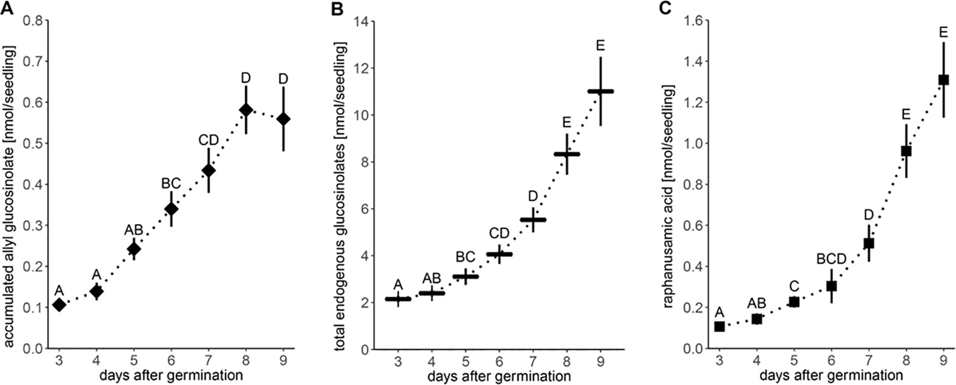 Noticeable increases of glucosinolate content between five and seven days after germination correlated with the development of the first lateral roots and the expansion of the first true leaves, respectively. Concurrent with these physiological changes in seedling development and the pattern of glucosinolate accumulation, levels of raphanusamic acid show increases at five and seven days after germination (P < 0.001, Figure 2B).