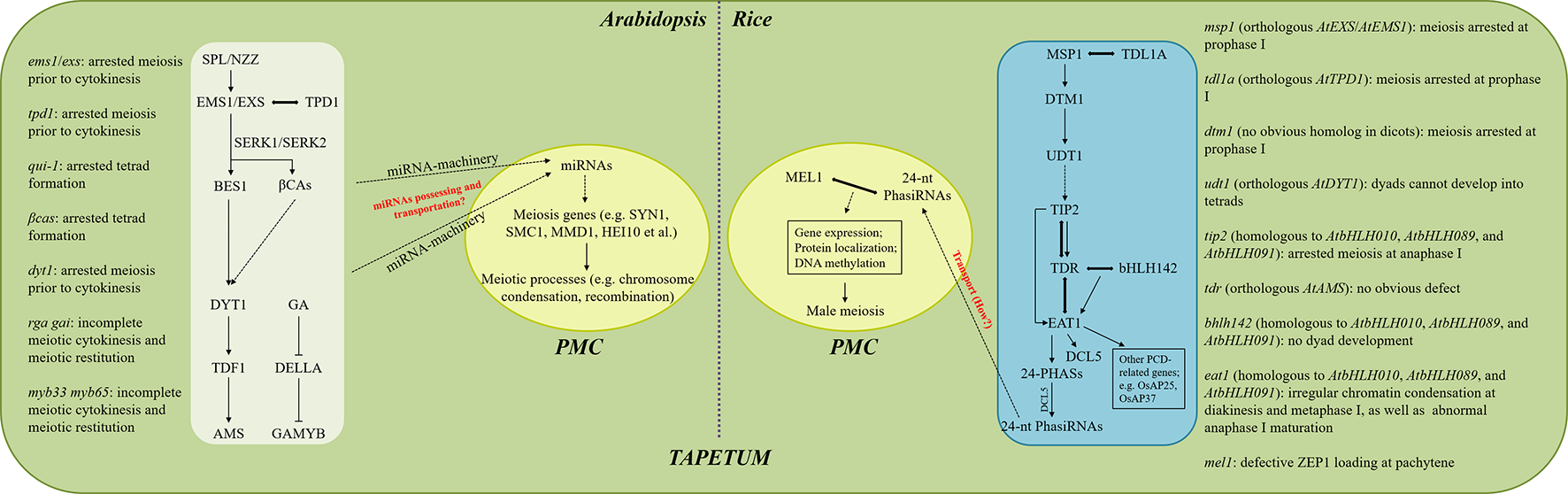 Proposed modeling of tapetum-dependent regulation of male meiosis in Arabidopsis and rice. Meiotic phenotypes in plants with different tapetum defects in Arabidopsis and rice are summarized on the left and right, respectively. The signaling pathways occurring in the white and blue boxes take place in the tapetal cells, while the ones shown in the central yellow ovals are happening in the PMCs. Arrows indicate the positive regulation of gene expression or the occurring of events, while the inhibiting lines represent negative regulation. Double-headed arrows indicate protein interaction. Dotted arrows indicate unclear or uncertain mechanisms. Key but uncertain mechanisms are marked by red.