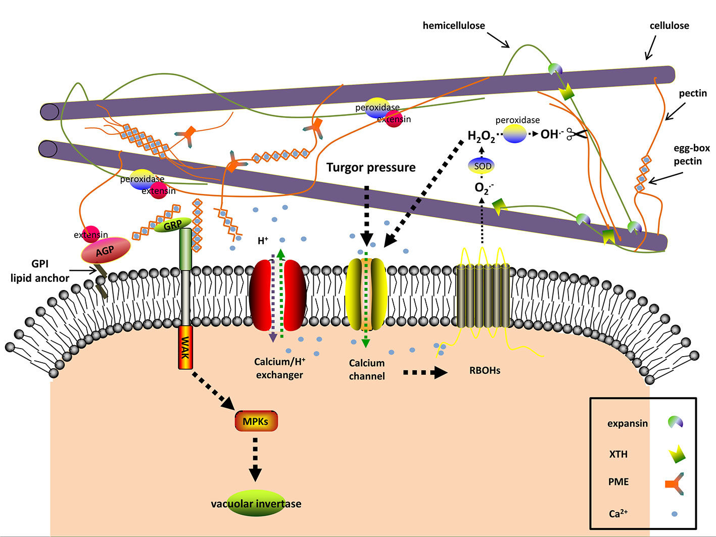Figure 2 The predicted interactions among apoplastic proteins and signaling molecules in resurrection plants during dehydration. Dehydration induces turgor pressure changes, which are sensed by mechanosensitive (MS) calcium channels As a consequence [Ca2+]cyt levels rise. The plasma membrane-localized NADPH oxidases (respiratory burst oxidase homologs, RBOHs) are activated through binding [Ca2+]cyt and produce O2−, a substrate of the cell wall superoxide dismutase (SOD). The apoplastic H2O2 as the product of SOD also leads to Ca2+ influx. Cell wall peroxidases produce hydroxyl radicals (OH−) with apoplastic H2O2 as substrate. The reactive OH− is able to rupture glycosidic bonds and leads to cell wall loosening. In addition to OH−, expansin and xyloglucan endotransglucosylase/hydrolase (XTH) may contribute to loosening the cell wall by disrupting the interaction between hemicellulose and cellulose during the early stages of dehydration and rehydration. Cell wall peroxidases facilitate wall stiffness by reinforcing the cross-linking of extensin with cell wall polysaccharides. Excessive [Ca2+]cyt is toxic and thus [Ca2+]cyt is transported to the extracellular space by Ca2+ efflux systems (Ca2+ exchangers are shown). The alkalization in the apoplast affects the activity of many cell wall proteins, one of which is pectinmethylesterase (PME). PME exerts its demethylesterifying role on pectin in alkalized apoplast and generates negatively charged pectins, which form the egg-box pectin gelatin with apoplastic Ca2+ and increase wall stiffness. Wall-associated kinase (WAK) forms a complex with the glycine-rich protein (GRP) and can detect the egg-box pectin. This then in turn activates the vacuolar invertase activity. The classic (glycosylphosphatidyl inositol) GPI-anchored cell wall arabinogalactan proteins (AGPs) are involved in signal transduction between the intracellular and extracellular compartments and act as plasticizers in resurrection plants against desiccation. The signaling pathway and the interactions in the apoplast are hypothesized according to the available literatures and the current research on cell walls of resurrection plants.