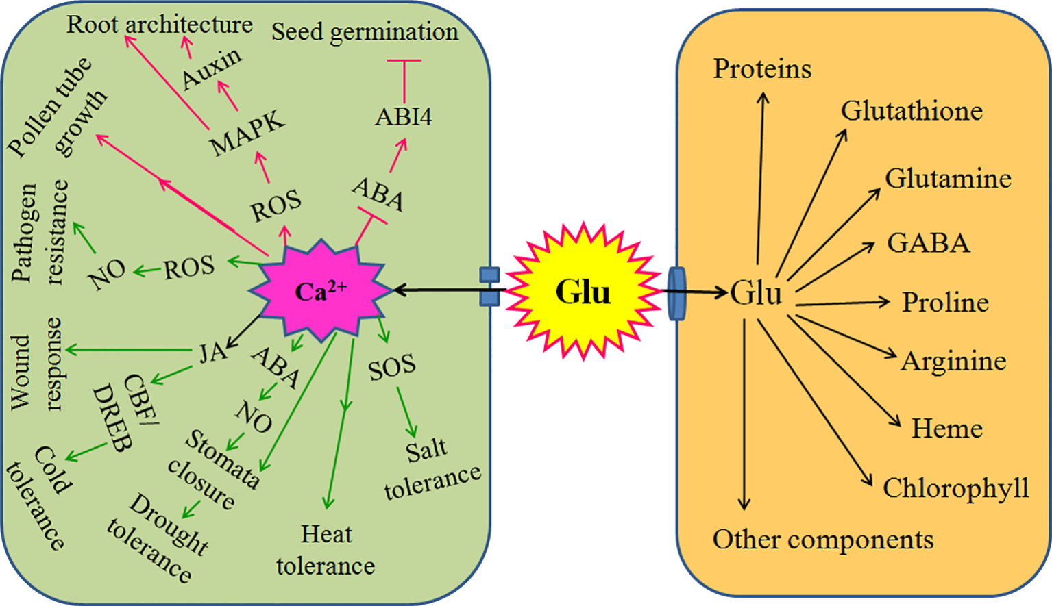 In animal system including human body, glutamate (Glu), also known as α-aminoglutaric acid, is a key excitatory neurotransmitter. Glu mediates neural signaling transduction in the synapses, participates in cognition, learning, memory, and other physiological and pathological processes (Forde, 2014; Reiner and Levitz, 2018; López-Bucio et al., 2019). Glu as a signaling molecule in animal system has been found for more than 50 years (López-Bucio et al., 2019). In presynaptic cells, Glu usually exerts its signaling role by two types of receptors, namely ionotropic glutamate receptors (iGluRs) and metabolic glutamate receptors (mGluRs). The later also known as G-protein coupled receptors (Forde, 2014; Reiner and Levitz, 2018; López-Bucio et al., 2019). The iGluRs can form ion (such as Ca2+, Na+) channels, which can be directly activated by their agonist Glu. The mGluRs can activate ion channels via coupling to G-protein signaling system by the following signaling pathways. 1) Ion channels can be directly activated by γ, β subunits of the G-protein; or 2) indirectly activated through triggering second messengers (such as inositol triphosphate: IP3; reactive oxygen species: ROS; nitric oxide: NO) (Brosnan and Brosnan, 2013; Reiner and Levitz, 2018). These indicate the signaling crosstalk between Glu and other signaling molecules in signaling transduction in plants.