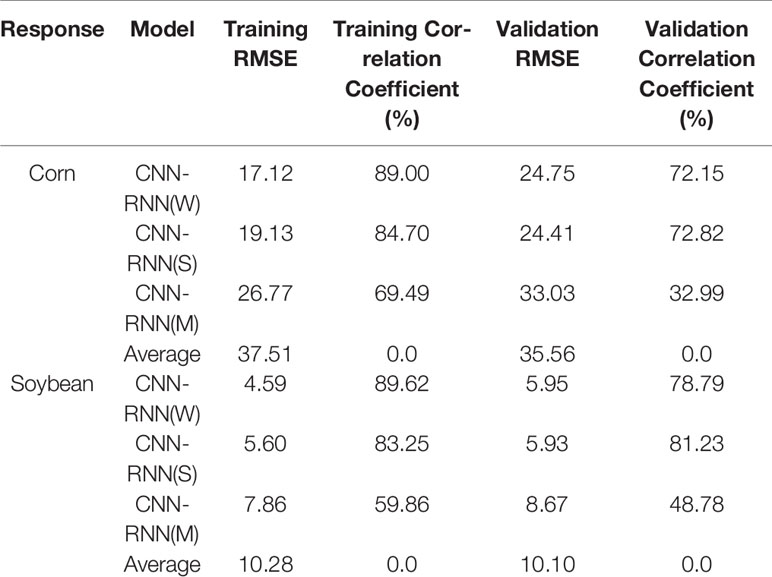 Table 5 Yield prediction performances of CNN-RNN(W), CNN-RNN(S), CNN-RNN(M), and Average model. Validation year is 2018. The unit of RMSE is bushels per acre.