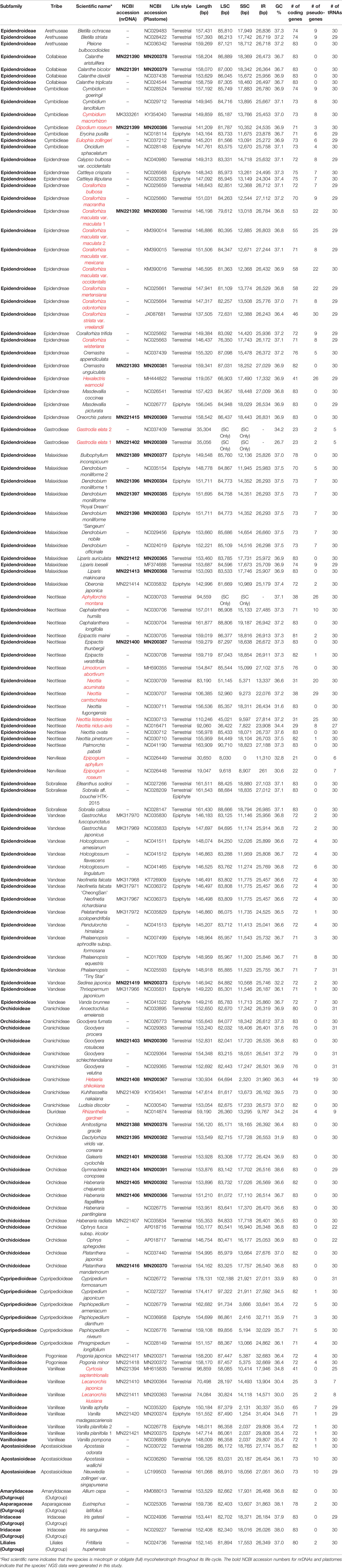 Feng, Y. L., Wicke, S., Li, J. W., Han, Y., Lin, C. S., Li, D. Z., et al. (2016). Lineage-specific reductions of plastid genomes in an orchid tribe with partially and fully mycoheterotrophic species. Genome Biol. Evol. 8, 2164–2175. doi: 10.1093/gbe/evw144