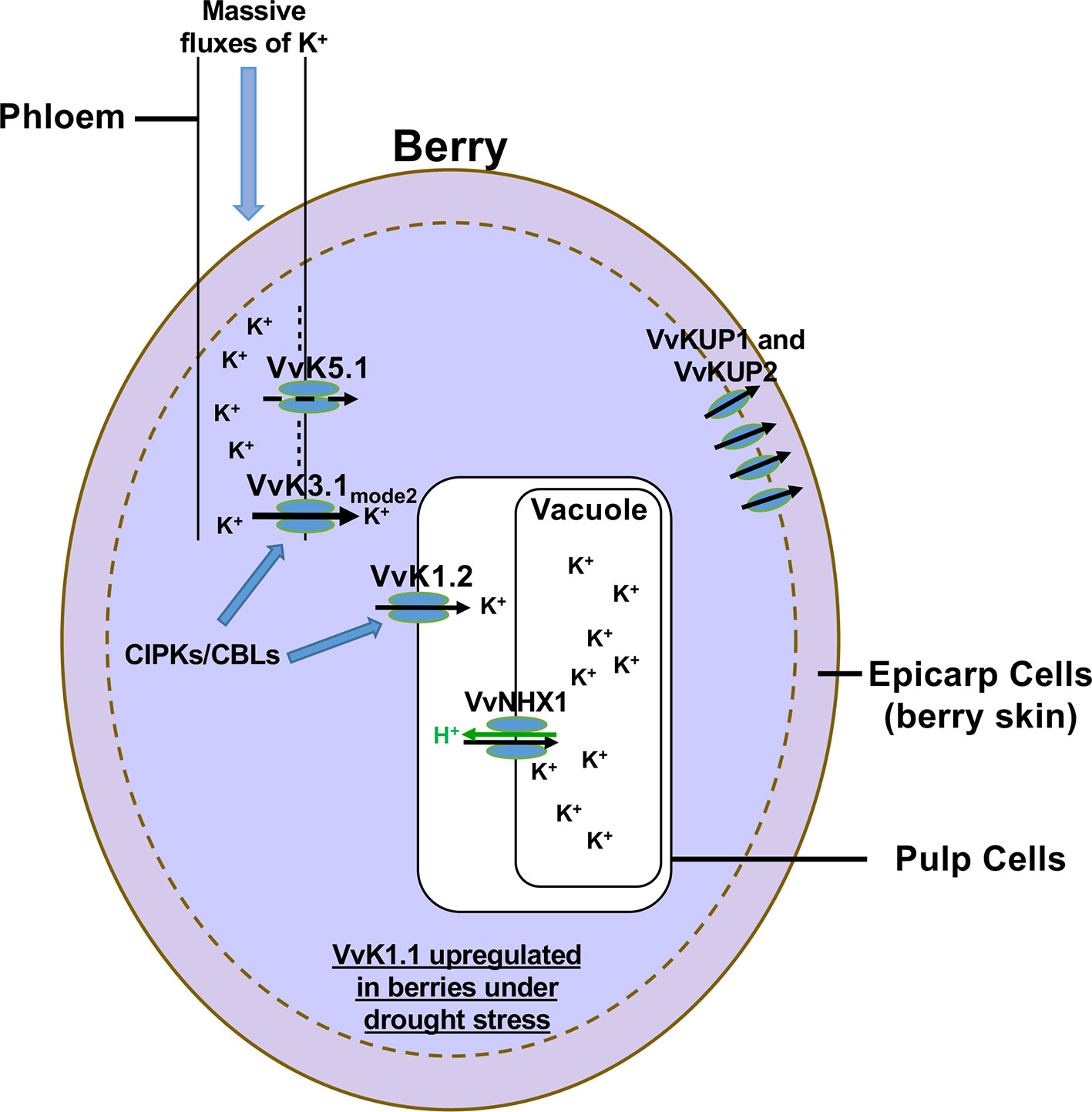 In grape, only two HAK-KUP-KT‐type K+ transporters have been studied so far. They are expressed most highly in the berry skin during the first phase of berry development (Davies et al., 2006) and therefore do not participate to the berry loading after veraison (the onset of ripening).