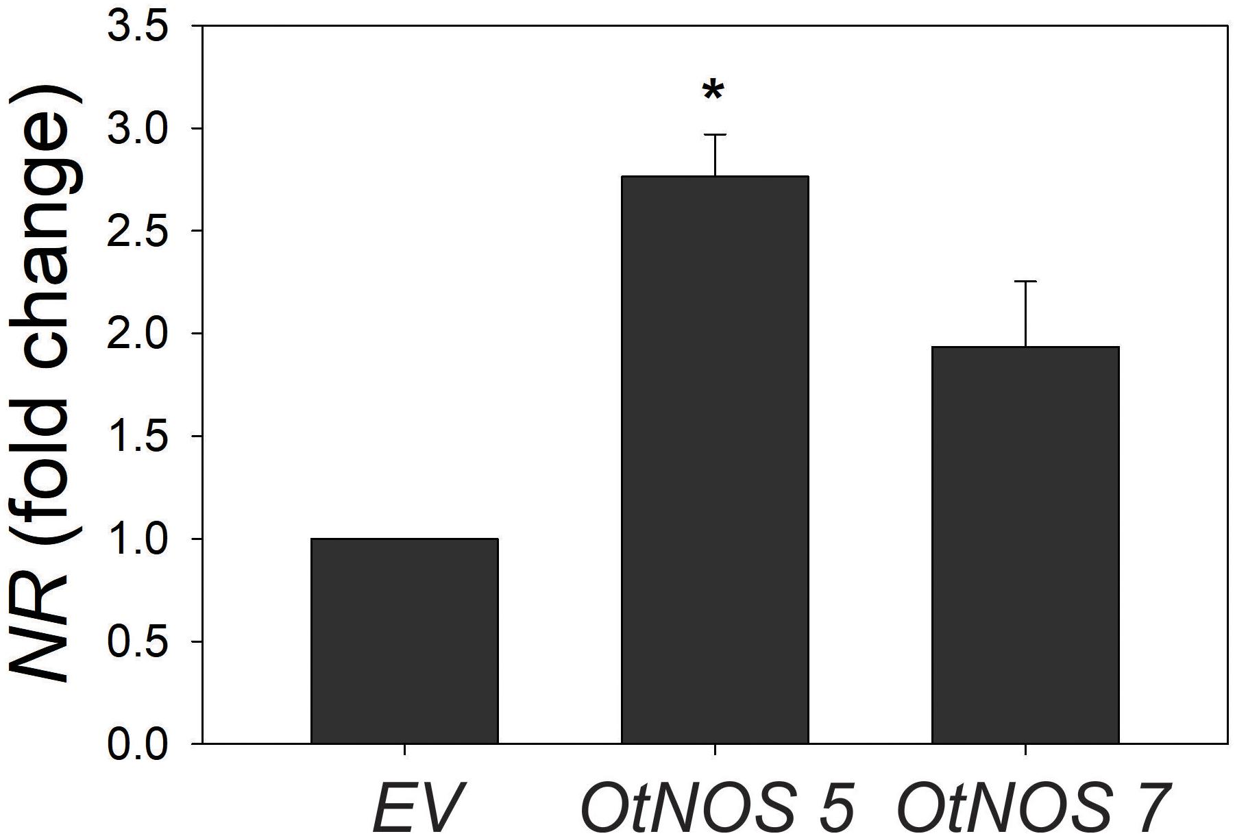 NR expression was higher in the transgenic line OtNOS 5 than in OtNOS 7, and it correlates with a higher OtNOS expression in OtNOS 5. NR expression and activity are regulated by many factors, nitrate, light, phytohormones, low temperature, drought, among others (Lillo et al., 2003; Lea et al., 2004; Park et al., 2011). Furthermore, NR is not only a key enzyme for N acquisition and assimilation in plants (Campbell, 2001), but also a key enzyme to modulate plant NO homeostasis (Tejada-Jimenez et al., 2019). The double mutant NR (nia1 nia2) has decrease nitrite levels and impaired NO synthesis (Modolo et al., 2006). These evidences indicate that there is a mutual regulation between NR activity and NO, hindering the interpretation of the results.