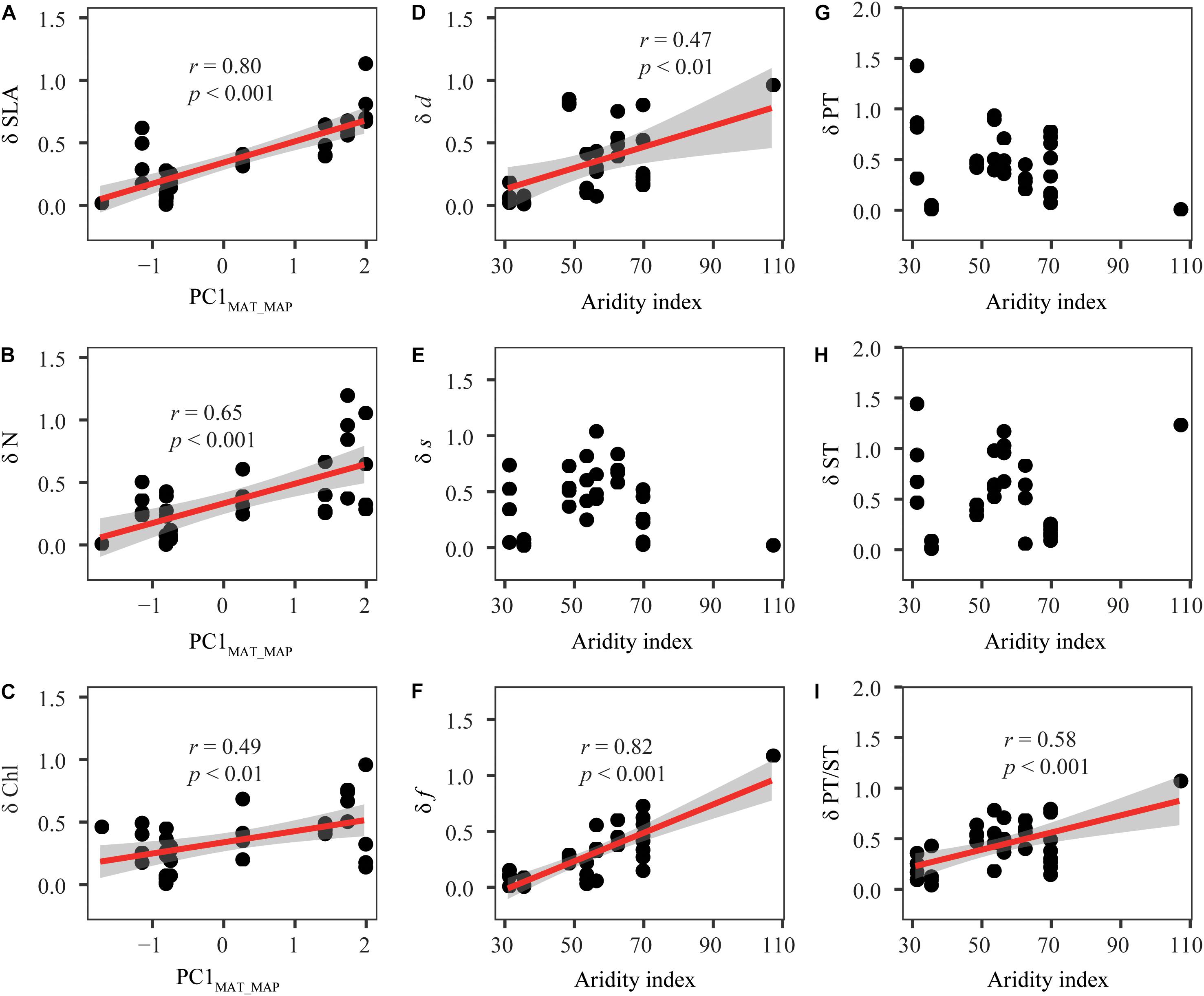 Figure 4. Relationships between the climate variables and the distance (δ) between the observed kurtosis and the boundary kurtosis. (A–I) Represent the relationships between the distance (δd) of specific leaf traits and climate. Details were shown in Supplementary Table S3. Each point represents one plant community (species richness ≥ 3). The red lines are fitted using linear regression. Shaded areas indicate the 95% confidence interval. SLA, specific leaf area; Chl, leaf chlorophyll content; N, Leaf nitrogen content; d, stomatal density; s, stomatal size; f, stomatal area fraction; PT, palisade tissue thickness; ST, spongy tissue thickness; PT/ST, the ratio of PT to ST. PC1MAT_MAP, the first principal component scores of mean annual temperature and precipitation, which accounted for 94.9% of total variation of mean annual temperature and precipitation. δ is the log-transformation of the distance between observed kurtosis and boundary kurtosis. Because some of the original data had very low values close to 0, one was added to all values before log-transformation.