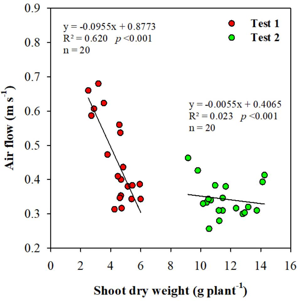 Figure 6. Regression between the air flow velocity at the different trays position (n = 20) of the Higher Plant Chamber (HPC) and the respective shoot dry weight (n = 20) in Test 1 and Test 2.