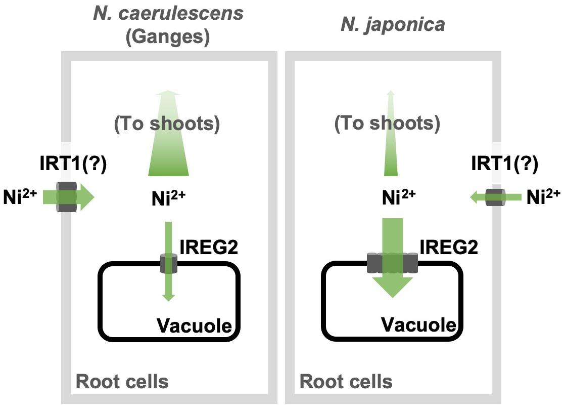 Figure 5. Schematic model of IREG2-dependent mechanism causing differential Ni accumulation in N. japonica and N. caerulescens. The gray rectangles and black rectangles denote the root cell membranes and the vacuole membranes, respectively.
