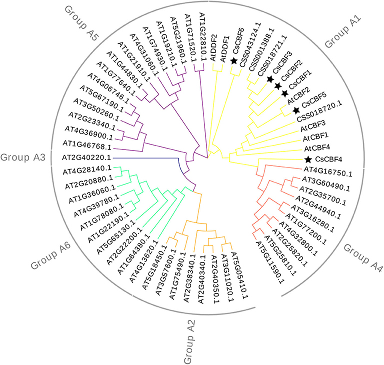 A phylogenetic tree was constructed using the neighbor-joining method with the MEGA program to explore the evolutionary relationships among CBF homologs in C. sinensis and A. thaliana (Figure 2). The 60 collected DREBs from C. sinensis and A. thaliana were clustered into six groups. All 10 CsCBF proteins were clustered together with AtDDF1-2 and AtCBF1-4 in Group A1. The result showed that CsCBFs belongs to DREB-A1 subfamily.